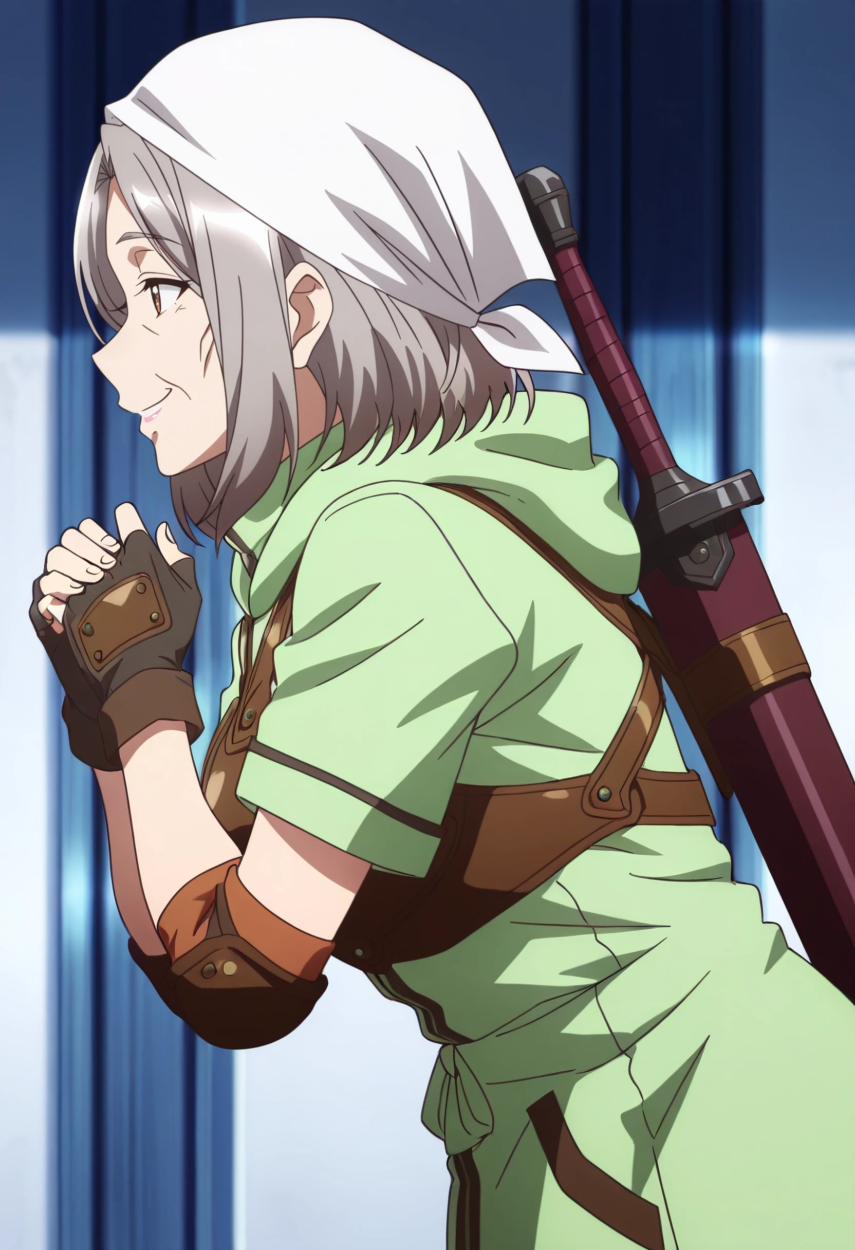 HoxieBreastplate, hood, green jacket, bandana, armor, gloves, breastplate, jacket, hat, short sleeves, turtleneck, white headwear, fingerless gloves, green hoodie, hood down, elbow pads, weapon on back,