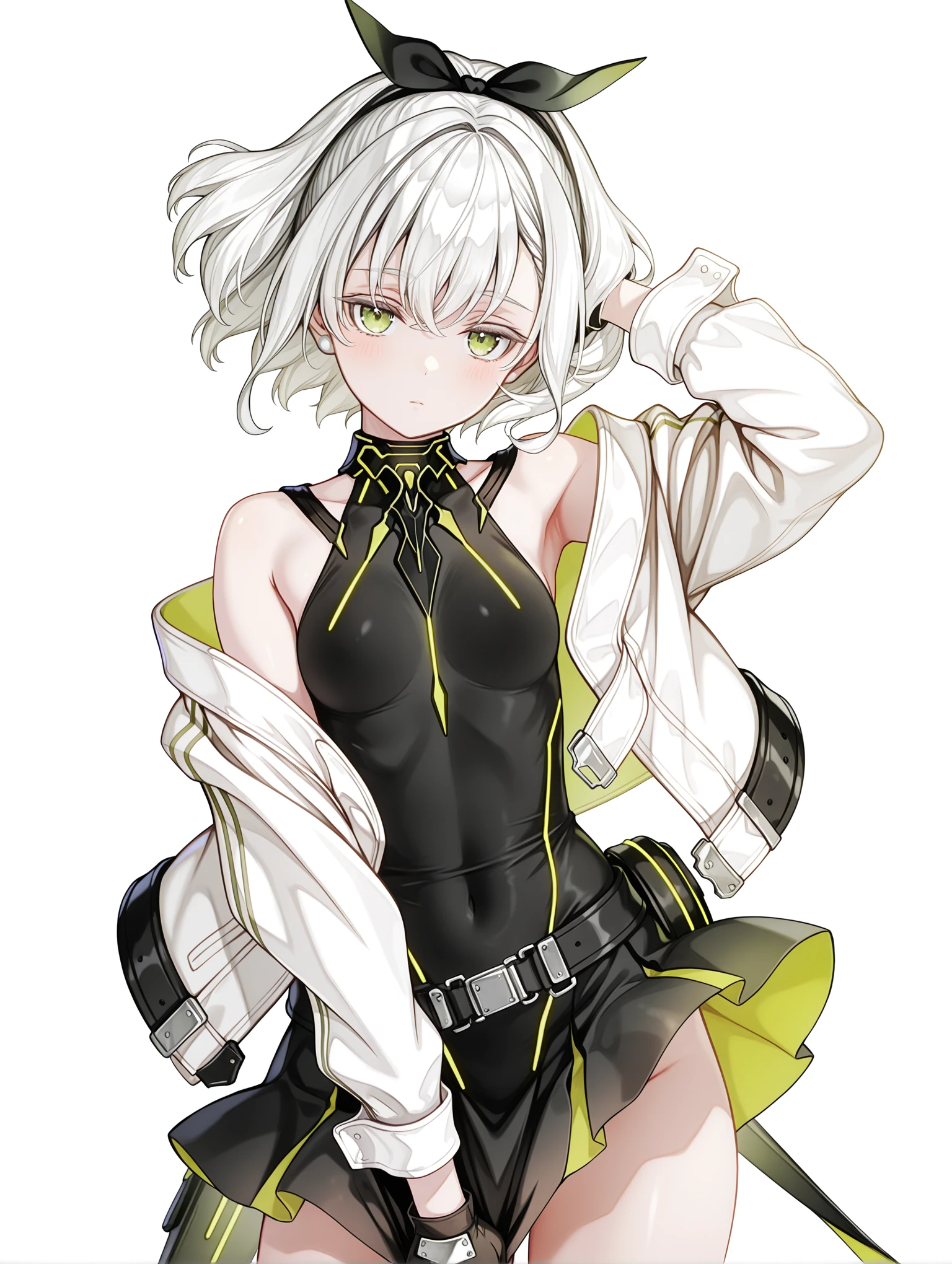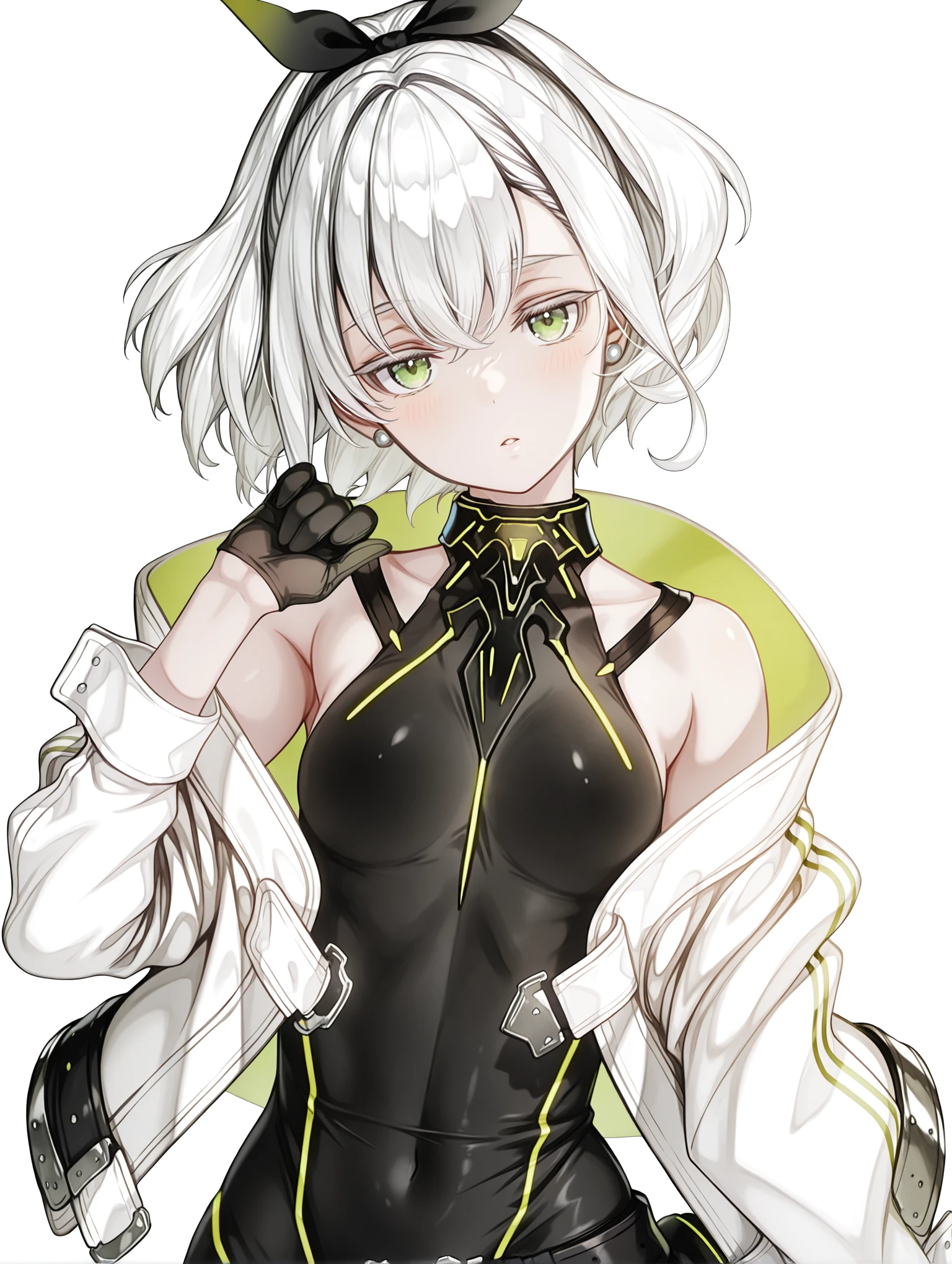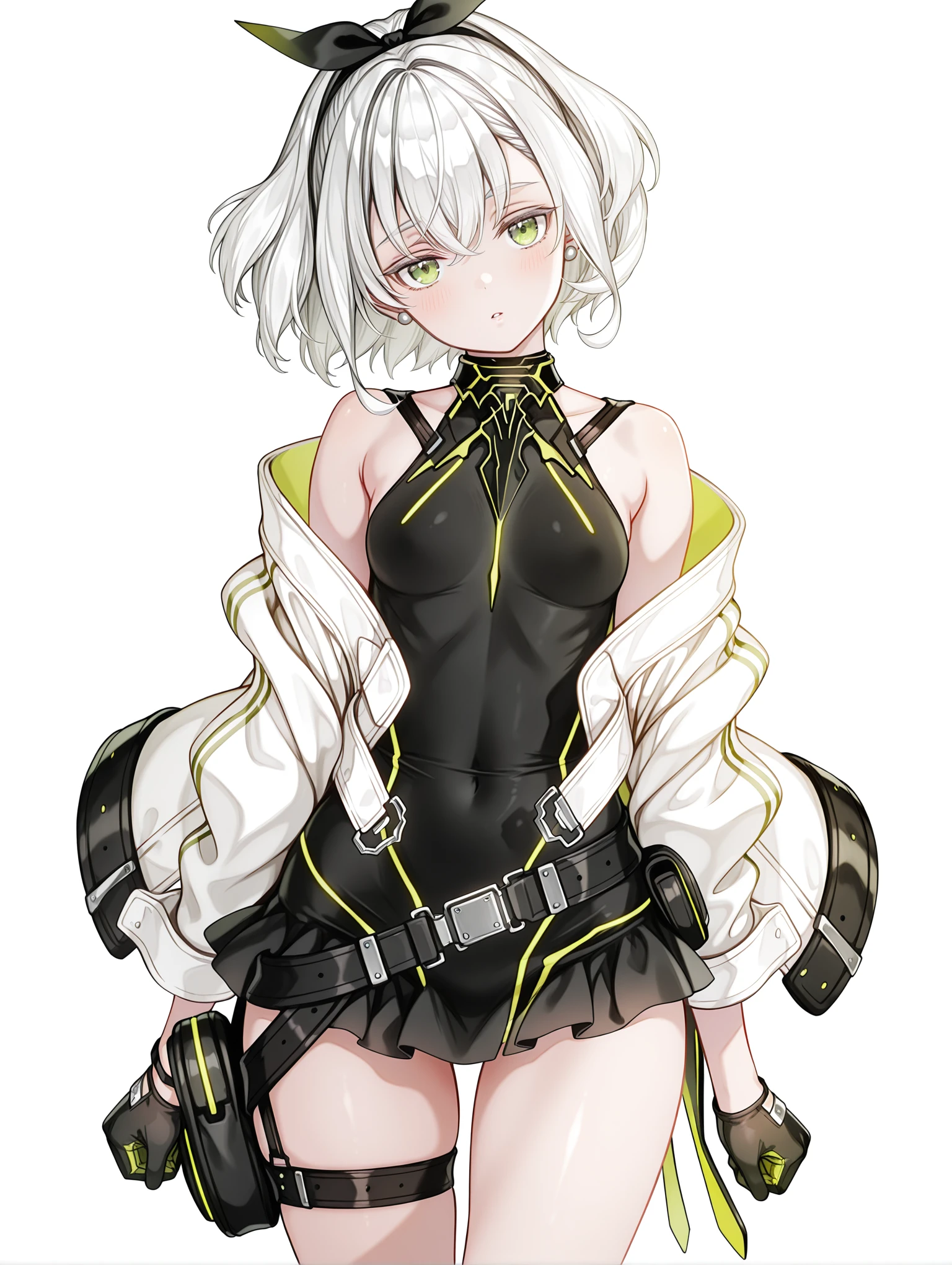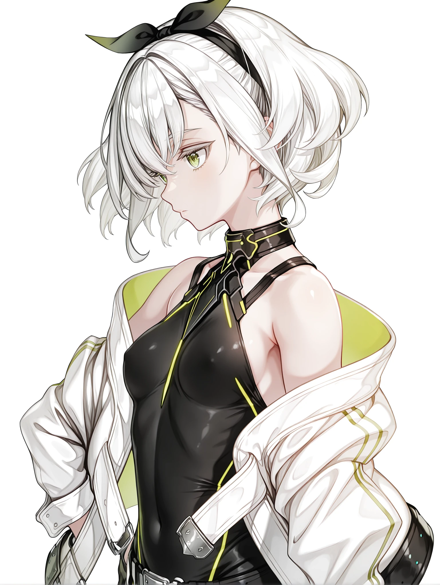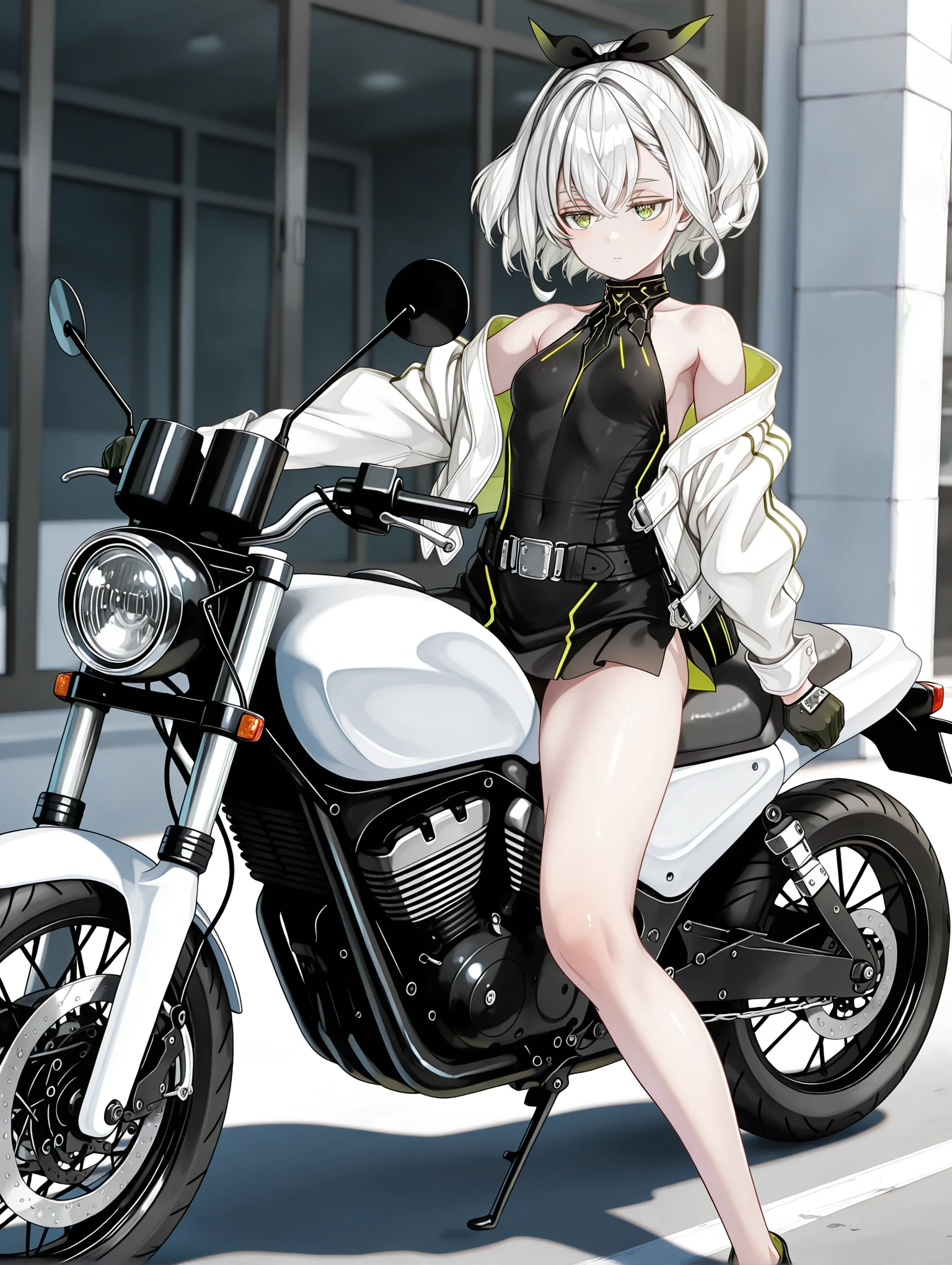 tomomi,hair ribbon,white hair,green eyes,short hair,