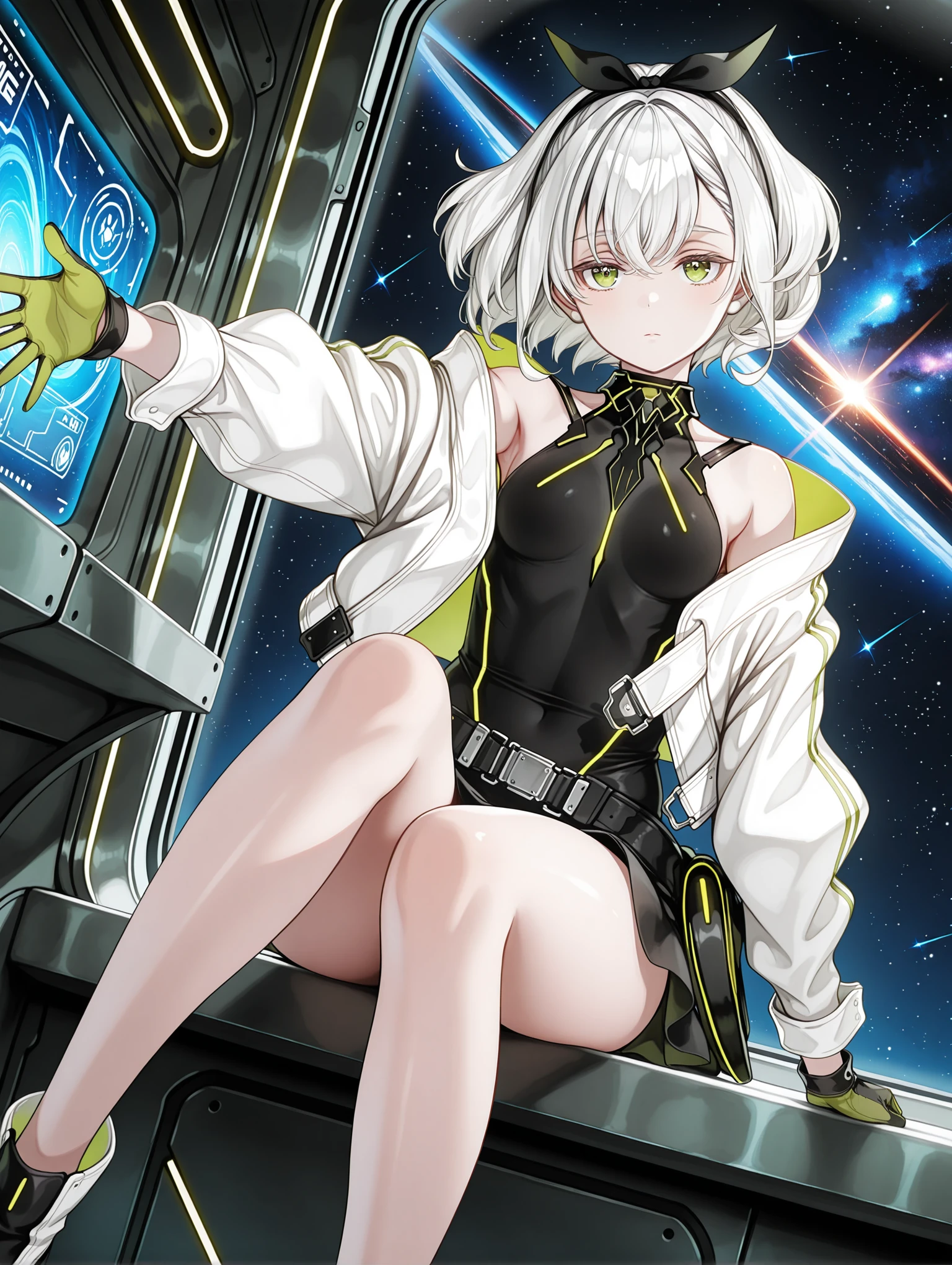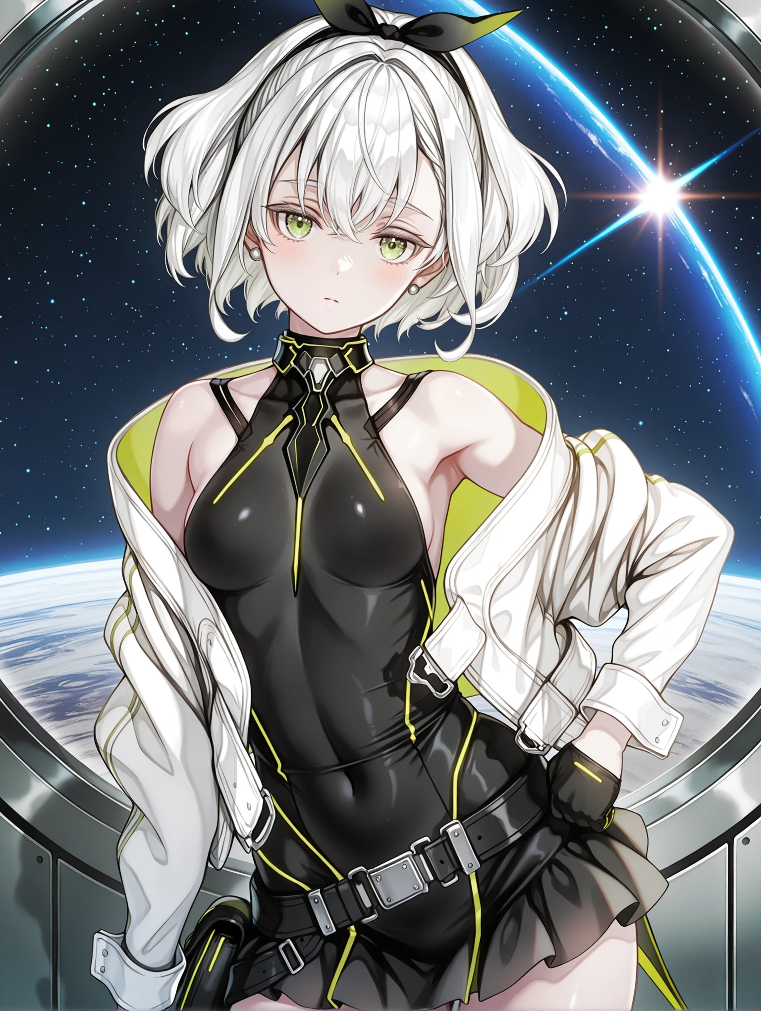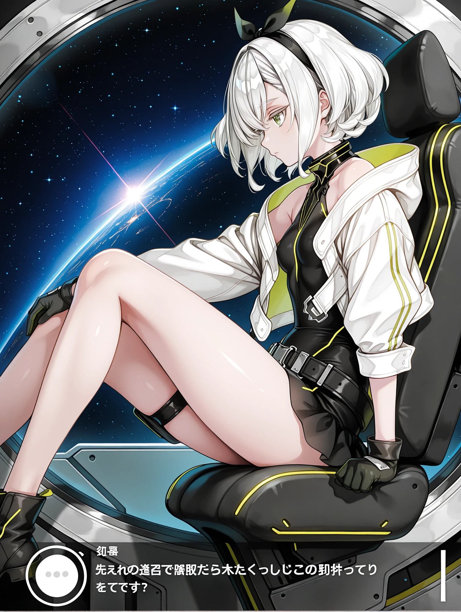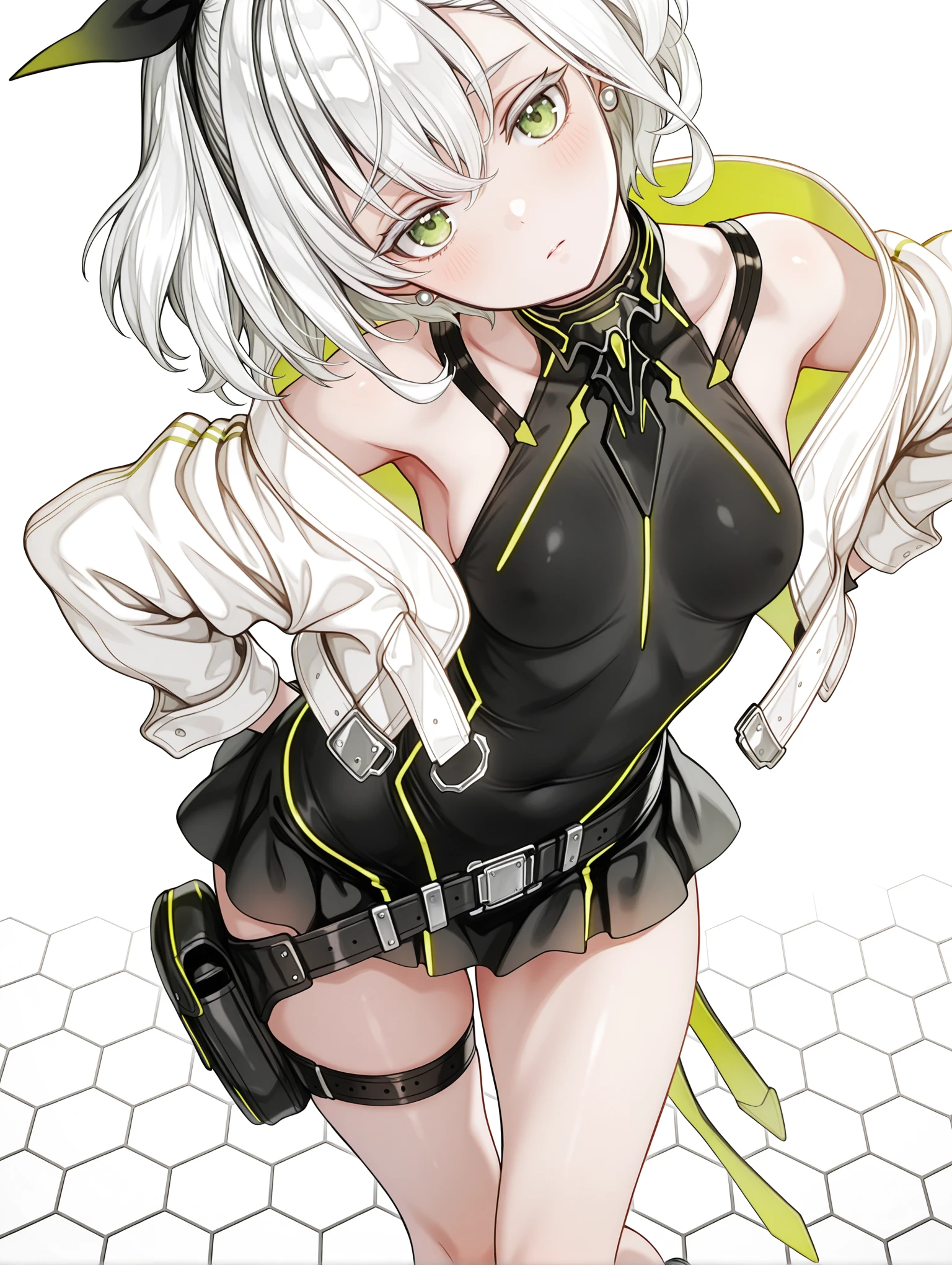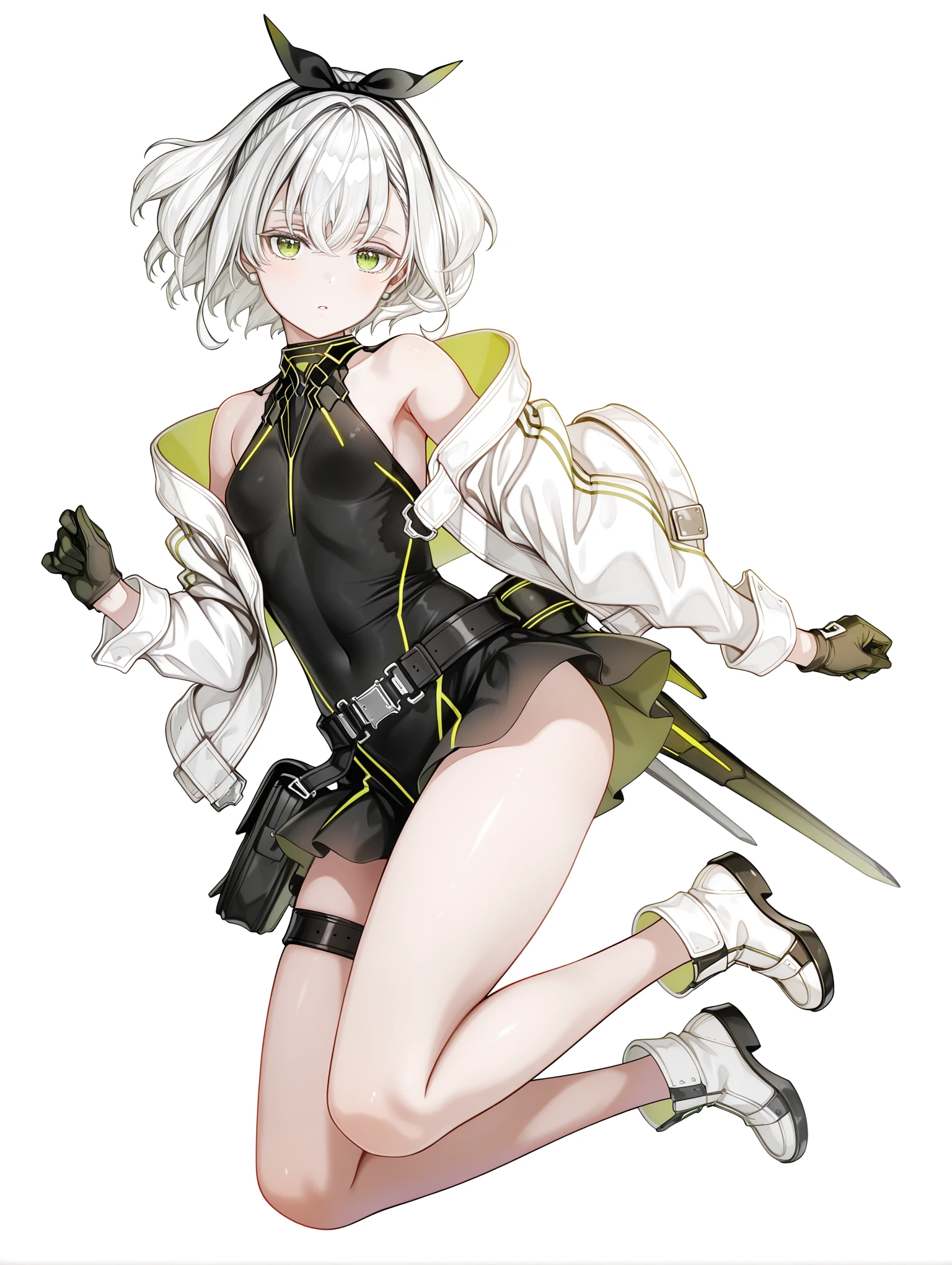 tomomi,hair ribbon,white hair,green eyes,short hair,