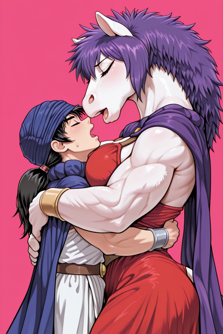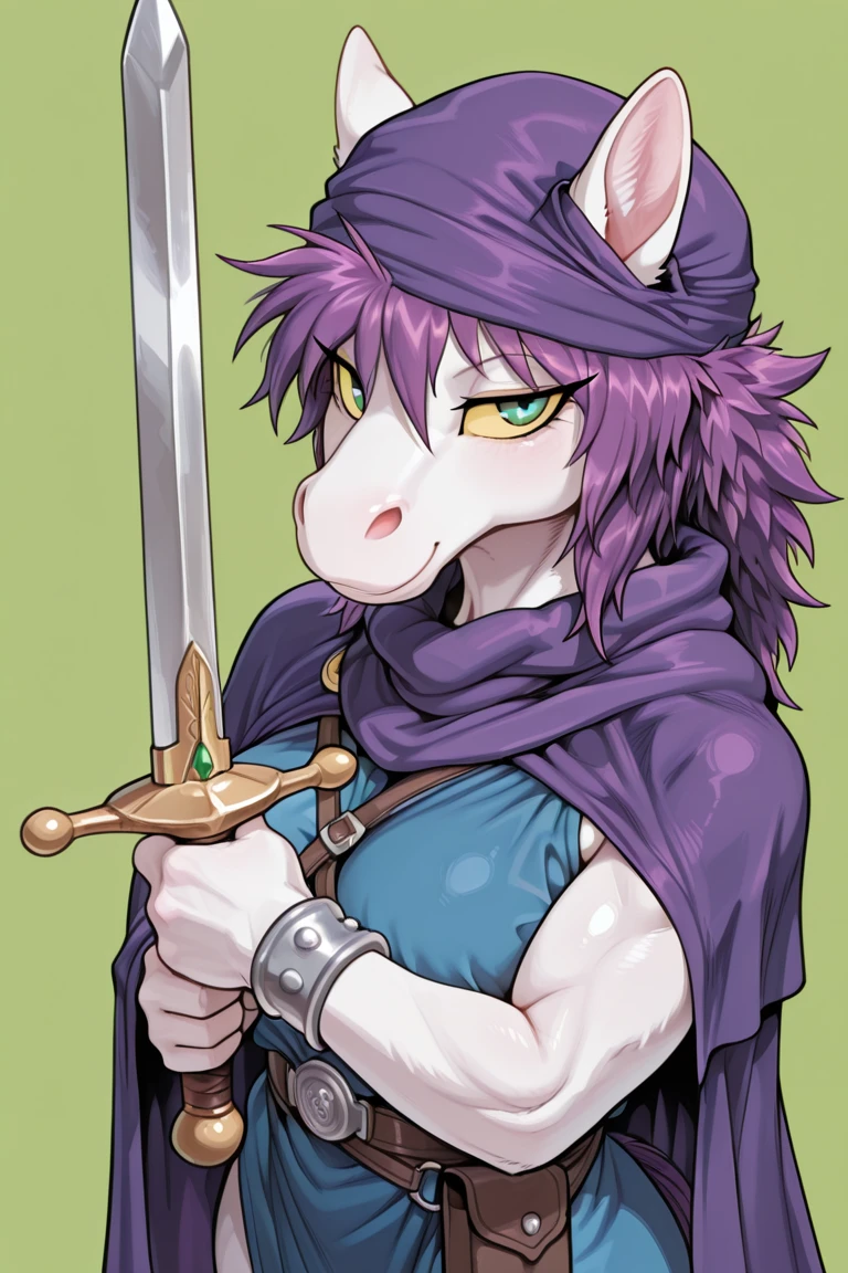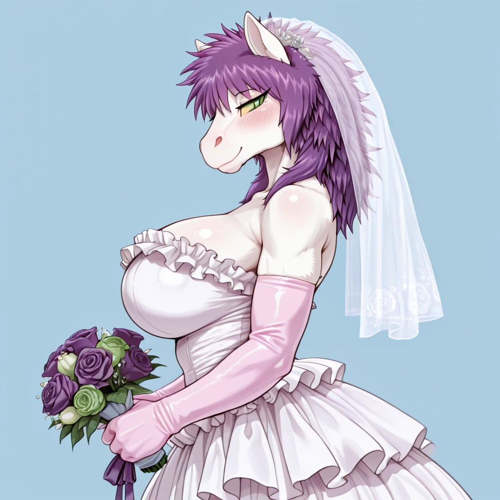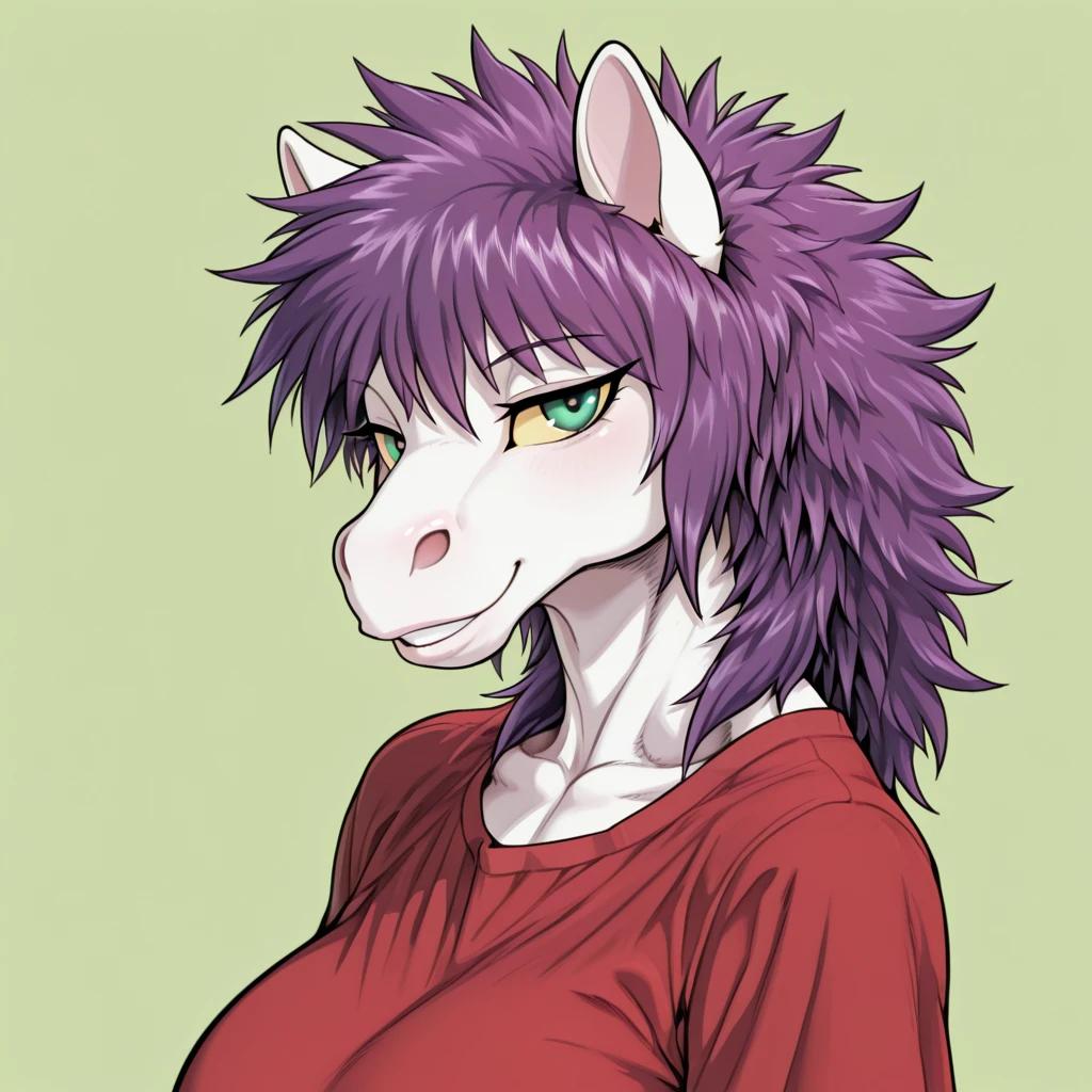 Tags: FemKon, anthro, furry female, horse girl, green eyes, medium hair, spiked hair, purple hair,