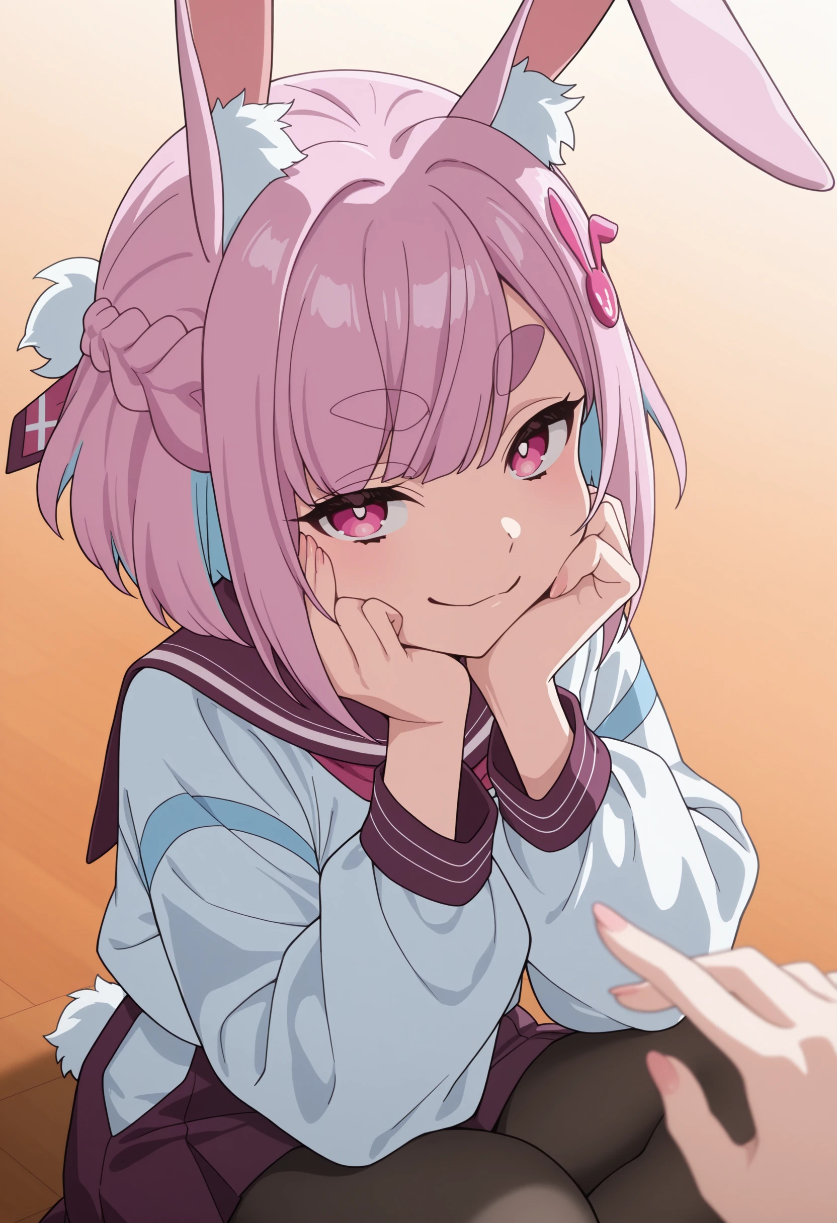 pink eyes, pink hair, short hair, bunny ears, hair accessory, uniform,