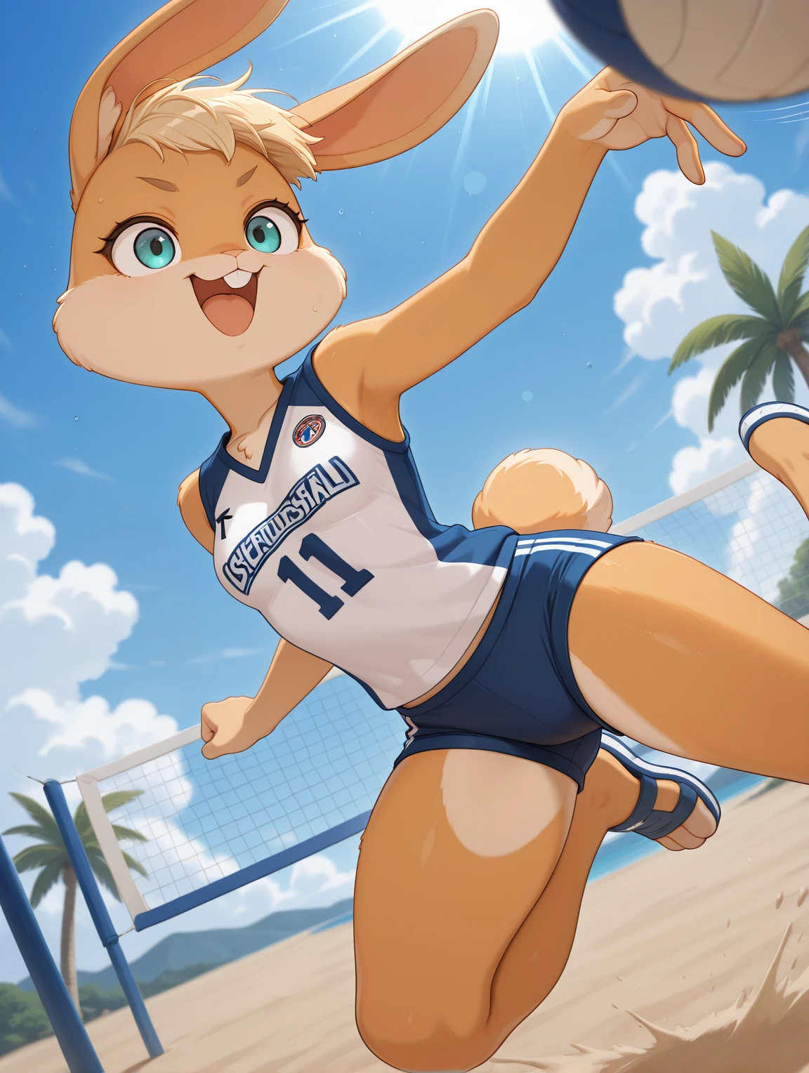 Additional tags: furry female, two-tone fur, orange fur, blonde fur, body fur, blonde hair, very short hair, rabbit nose, rabbit ears, rabbit tail, tied ears, animal feet, aqua eyes, purple eyeshadow, buck teeth, small ???????, white gym shorts, white crop top, white gloves, full body,