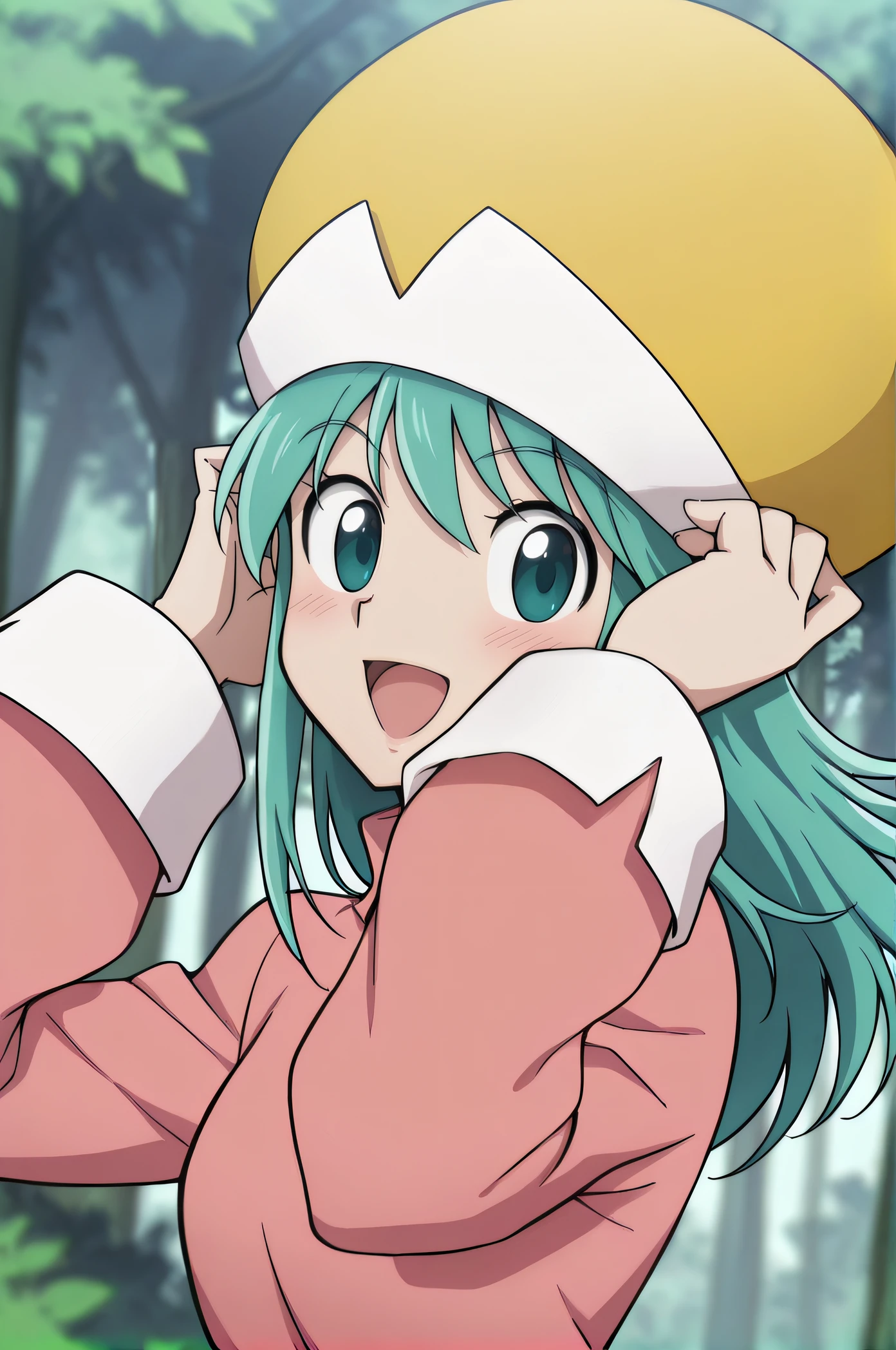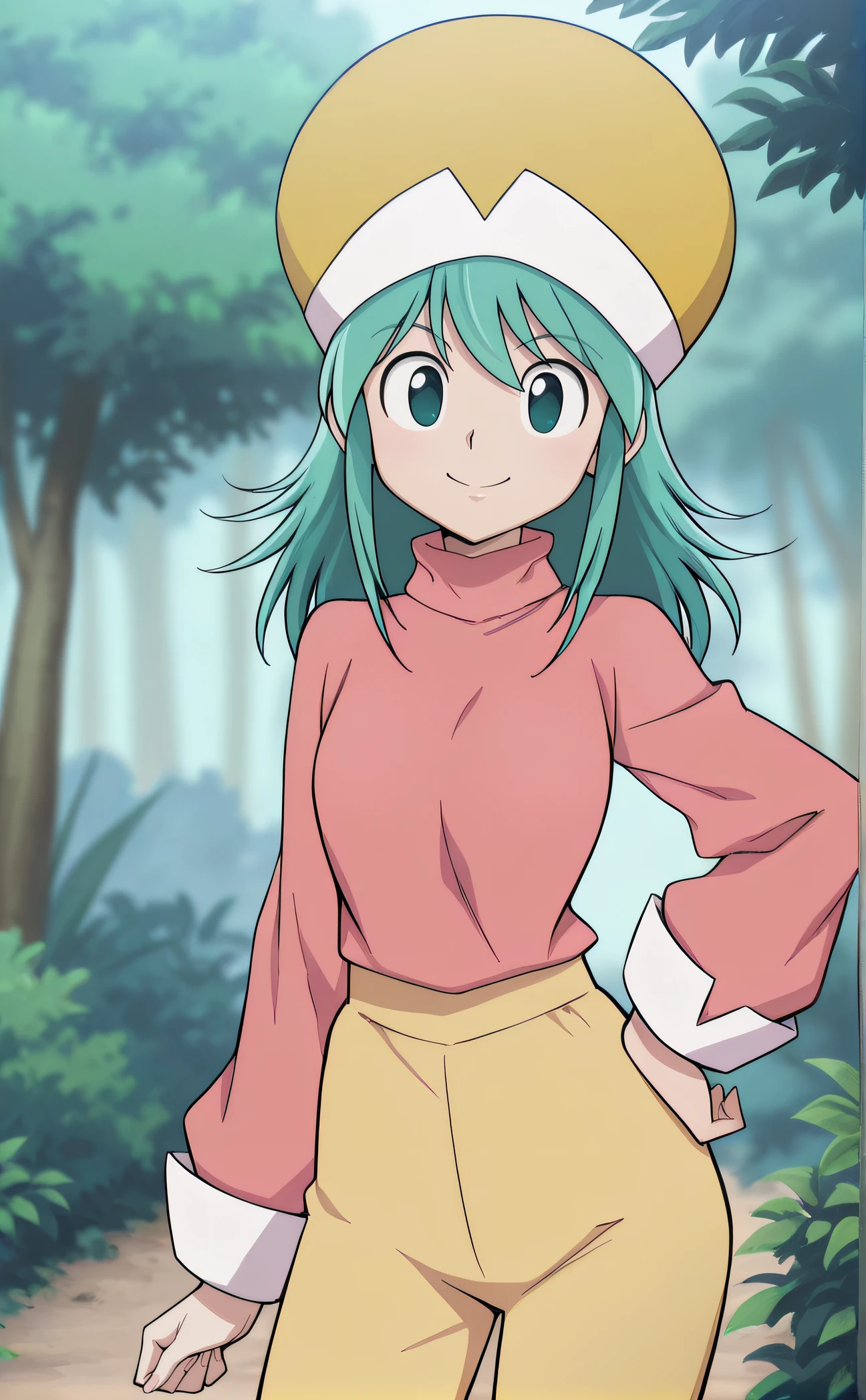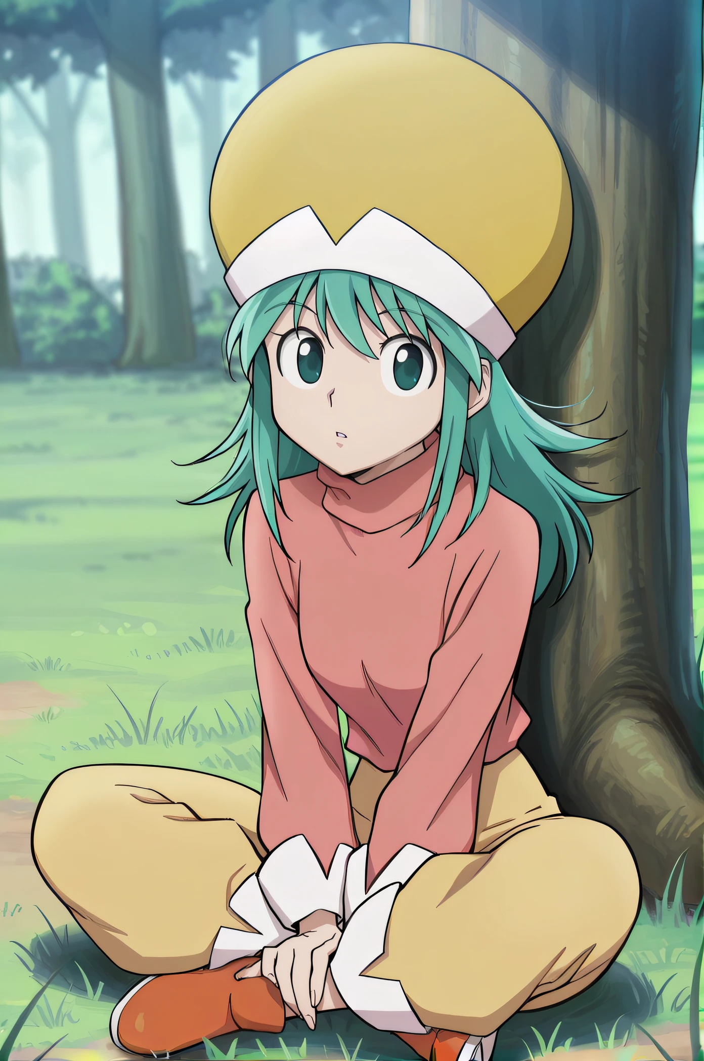 yellow headwear, pale red shirt, turtleneck, yellow pants, orange shoes