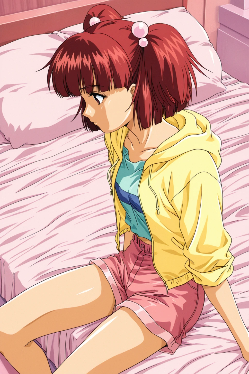 izyi HEXA NnH,anime screencap,Fujimura Saori,1girl,solo,red hair,short hair,hair bobbles,twintails,bangs,red eyes,yellow hoodie,,long sleeves,sleeves rolled up,shirt,midriff,pink shorts,short shorts,Sneakers,