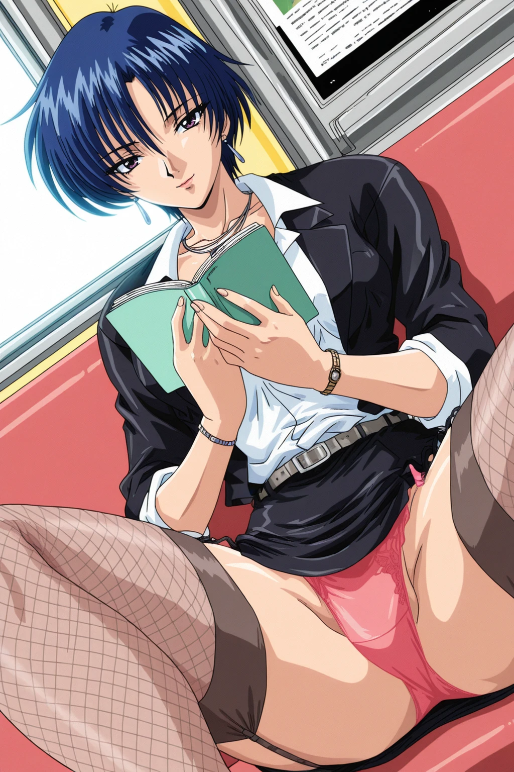 izyi HEXA NnH,anime screencap,Morishita Ayaka,1girl,solo,blue hair,short hair,purple eyes,lipstick,earrings,necklace,jewelry,business suit,formal,open suit,white shirt,collared shirt,belt,pencil skirt,fishnet thighhighs,garter straps,pink panties,lace,high heels,bracelet,watch, briefcase,