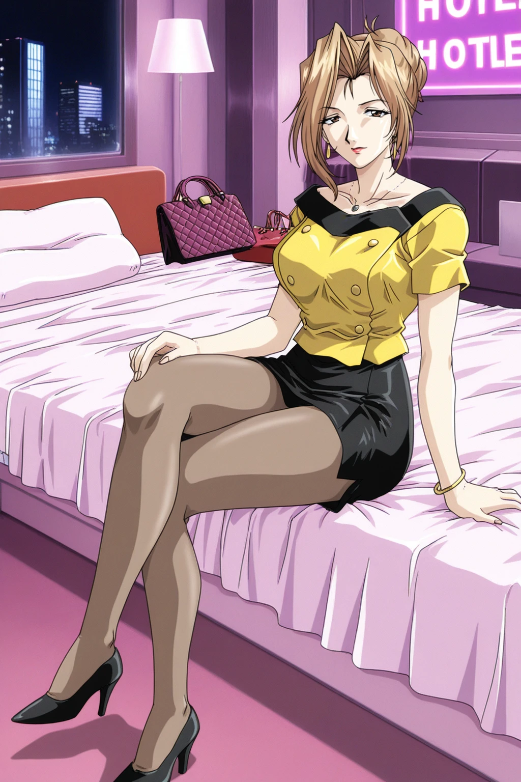 izyi HEXA NnH,anime screencap,Yoshikawa Reiko,1girl,solo,mature female,brown hair,short hair,single hair bun,hair up,brown eyes,lipstick,makeup,earrings,yellow shirt,short sleeves,necklace,jewelry,bracelet,pencil skirt,pantyhose,high heels,handbag,