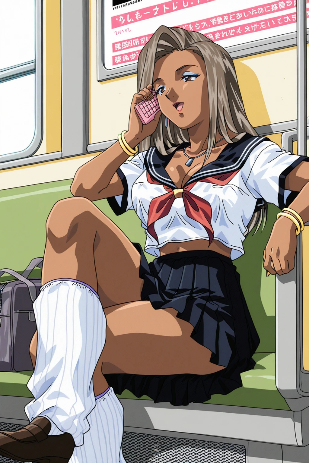 izyi HEXA NnH,anime screencap,Inaba Maki,1girl,solo,dark-skinned female,long hair,brown hair,brown eyes,makeup,eyeshadow,lipstick,cleavage,school uniform,serafuku,pleated skirt,midriff,loose socks,bracelet,jewelry,loafers,school bag,