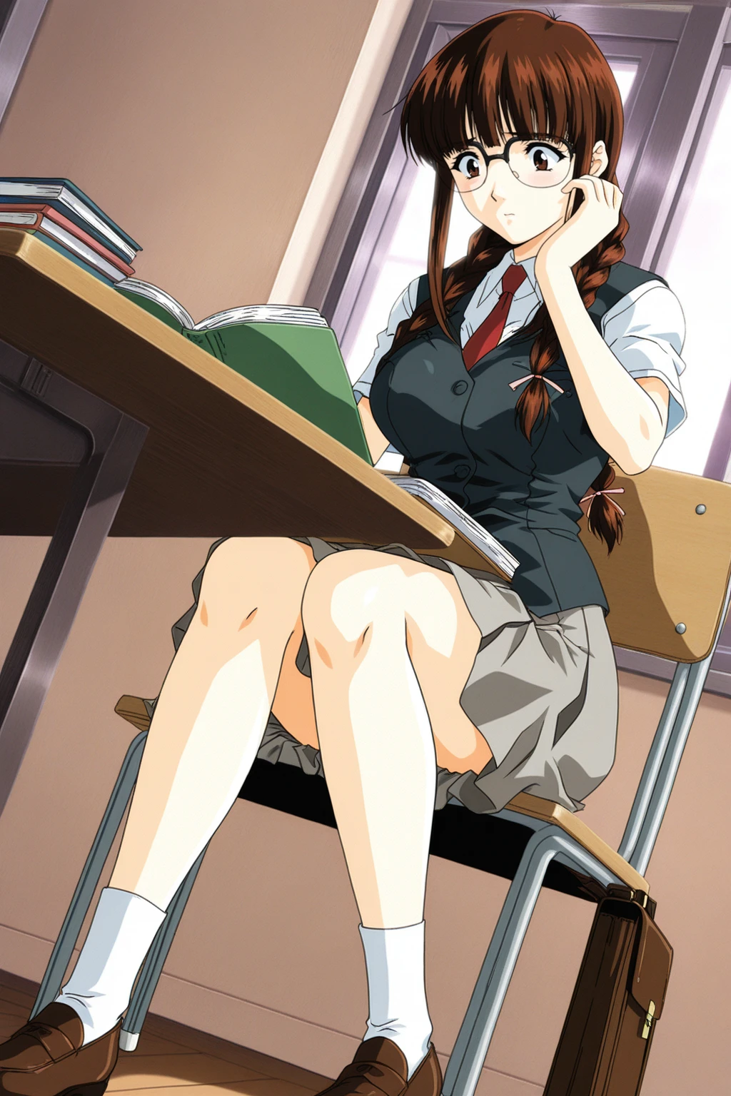 • izyi HEXA NnH,anime screencap,Someya Kiyoko,1girl,solo,brown hair,twin braids,bangs,long hair,hair over shoulder,glasses,black-framed eyewear,brown eyes,school uniform,black vest,red necktie,white shirt,short sleeves,collared shirt,grey skirt,white socks,loafers,school briefcase,