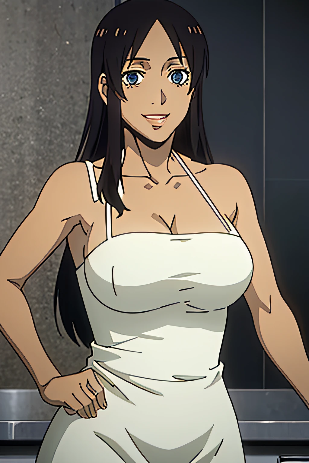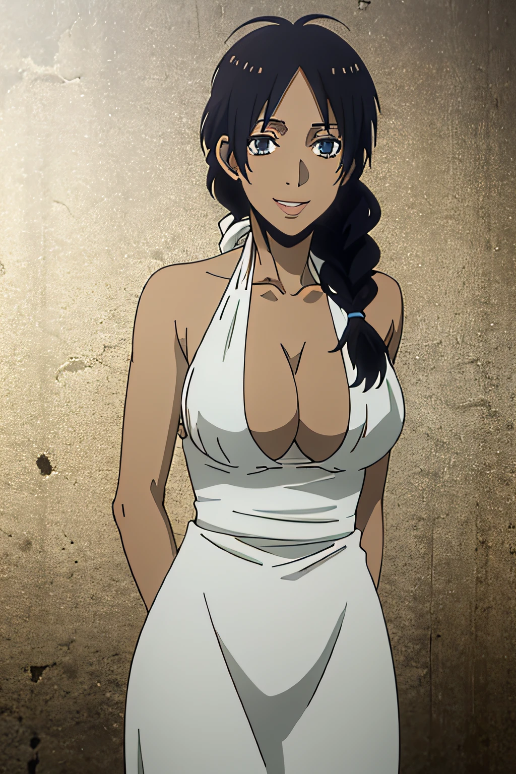 single braid, hair over shoulder, cleavage, evening dress, halterneck, legs,