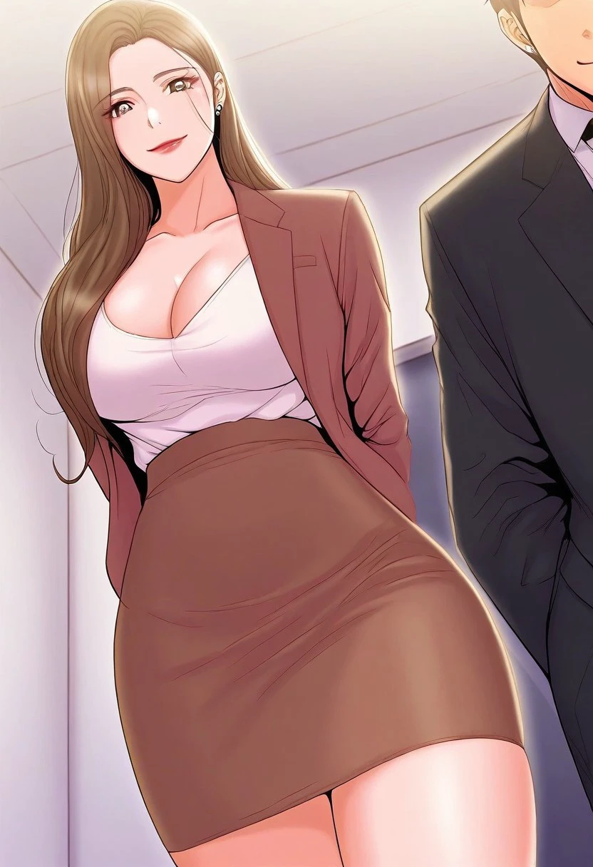 2. ((formal, white peplum jacket, brown pencil skirt, ))