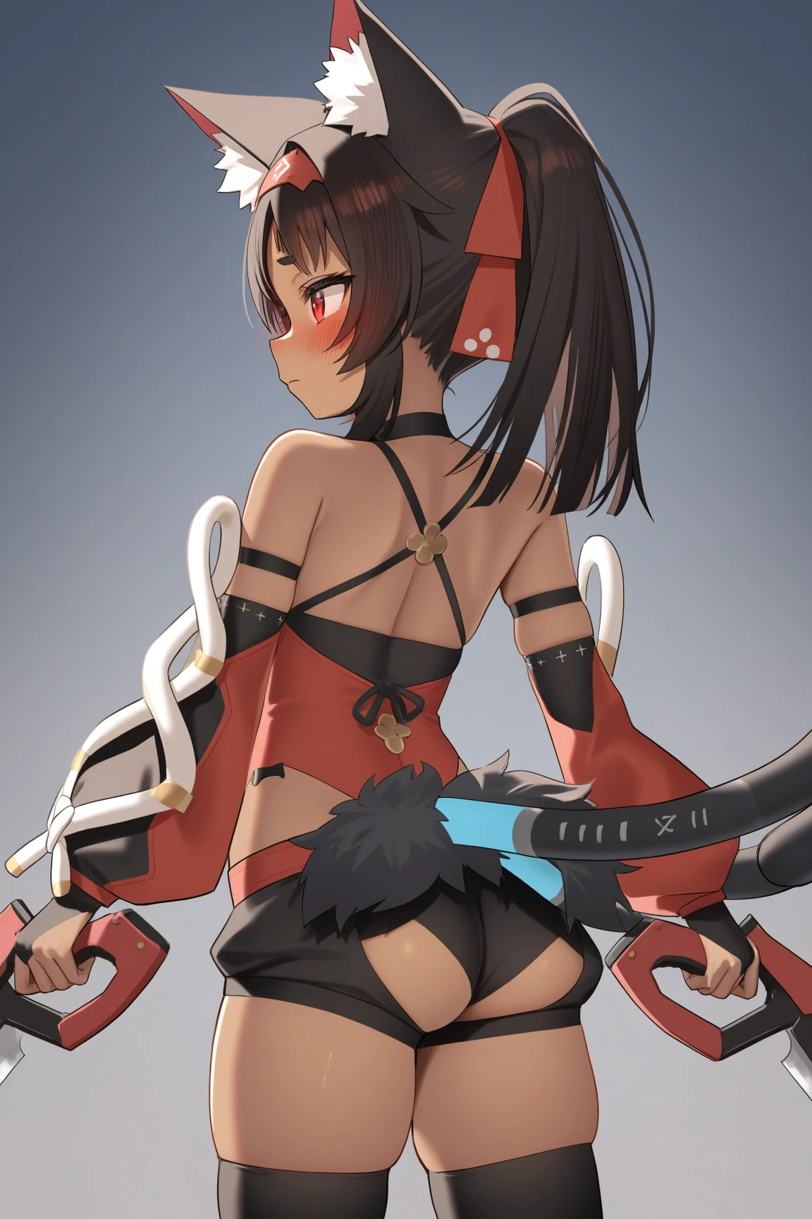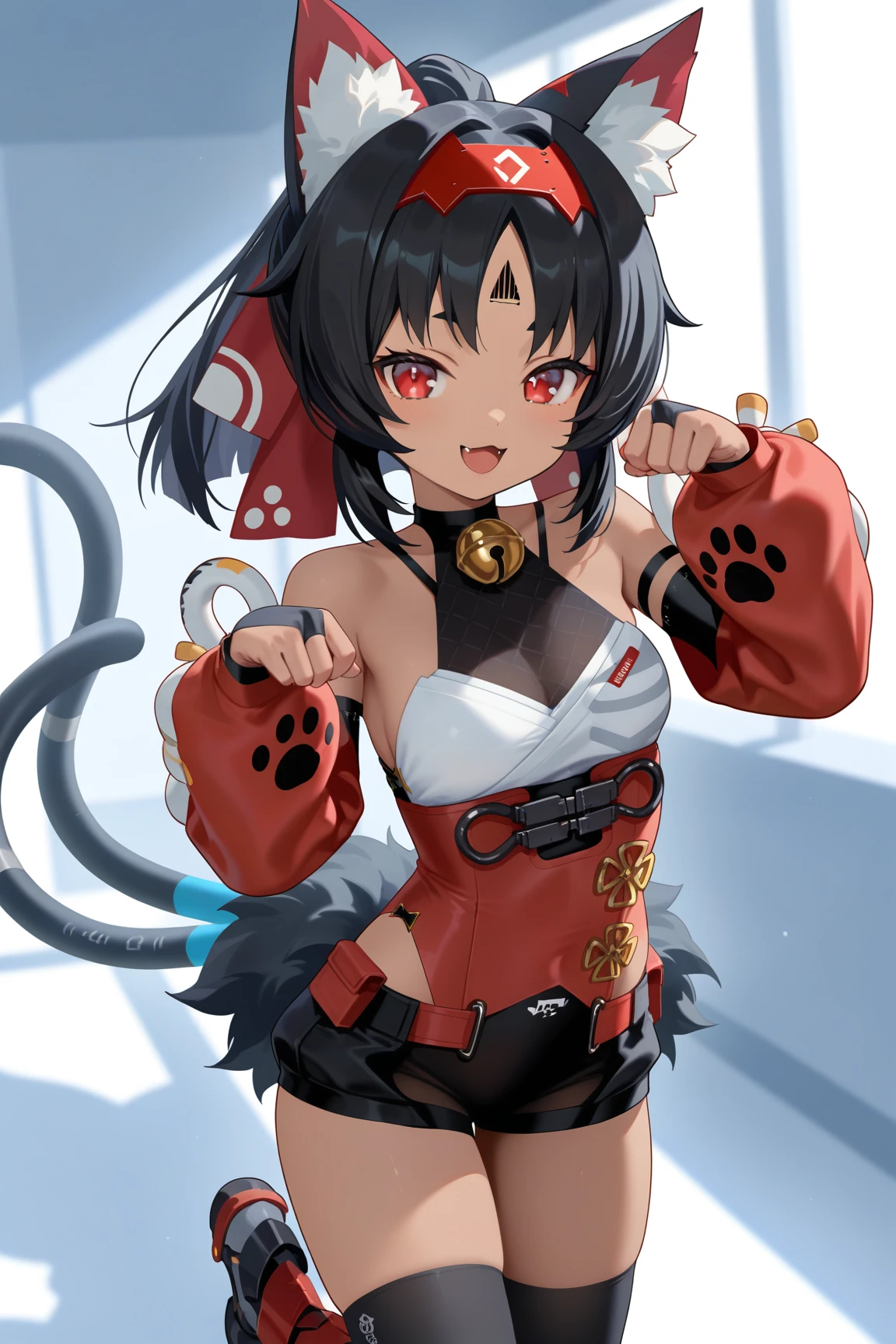 nekomiya mana, 1girl, animal ears, tail, solo, black hair, cat ears, red eyes, cat tail, bell, thighhighs, neck bell, animal ear fluff, shorts, cat girl, multicolored hair, gloves, detached sleeves, long hair, black shorts, fingerless gloves, black gloves, fang, jingle bell, red sleeves,