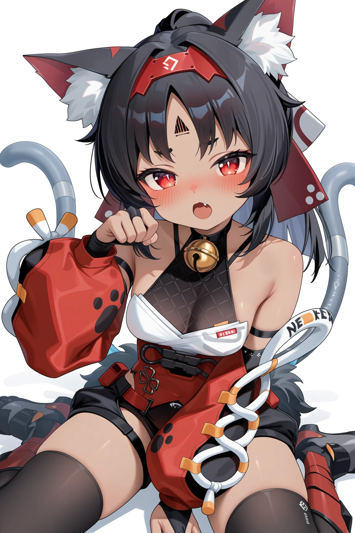 nekomiya mana, 1girl, animal ears, tail, solo, black hair, cat ears, red eyes, cat tail, bell, thighhighs, neck bell, animal ear fluff, shorts, cat girl, multicolored hair, gloves, detached sleeves, long hair, black shorts, fingerless gloves, black gloves, fang, wariza, jingle bell, red sleeves,