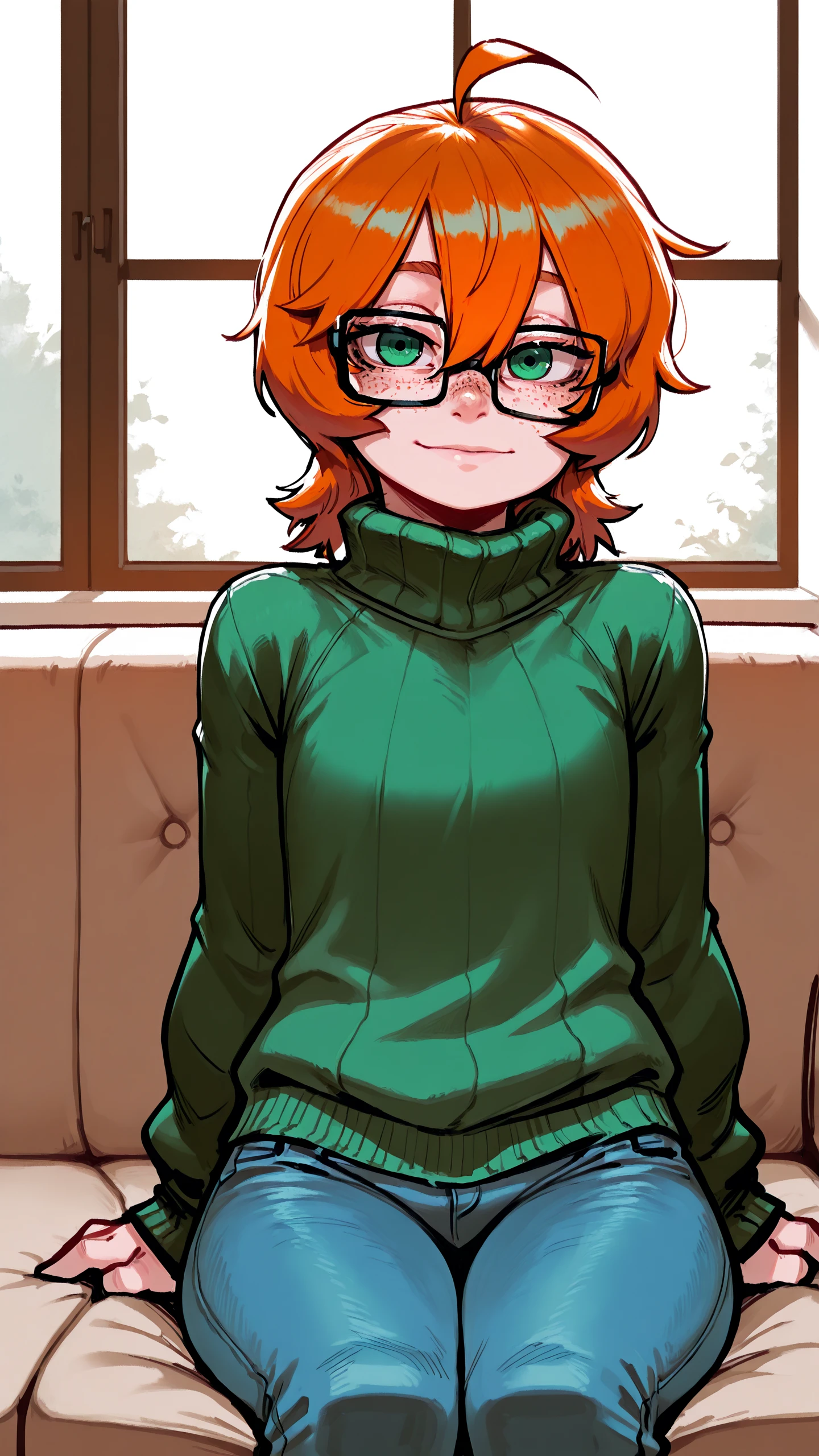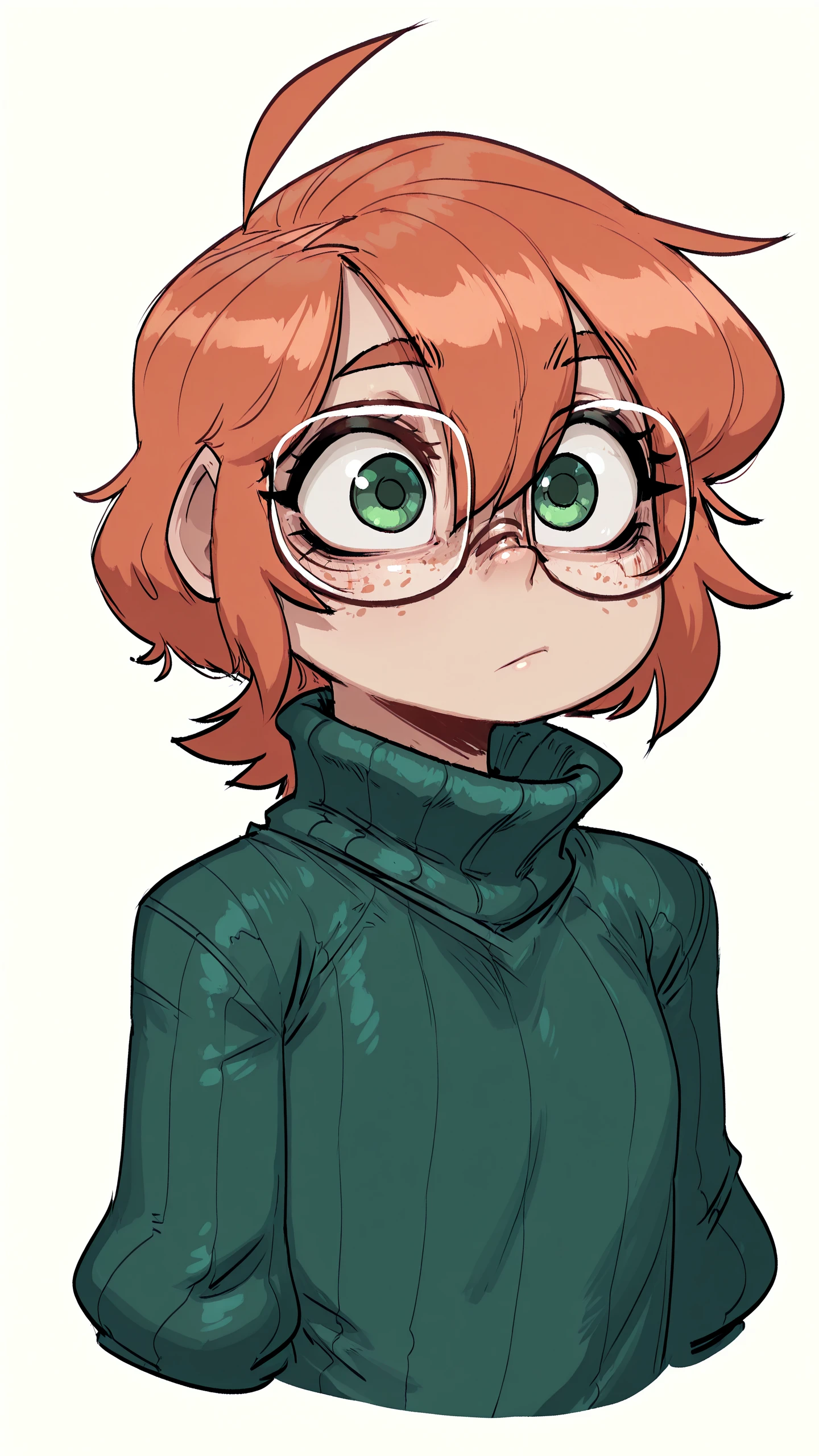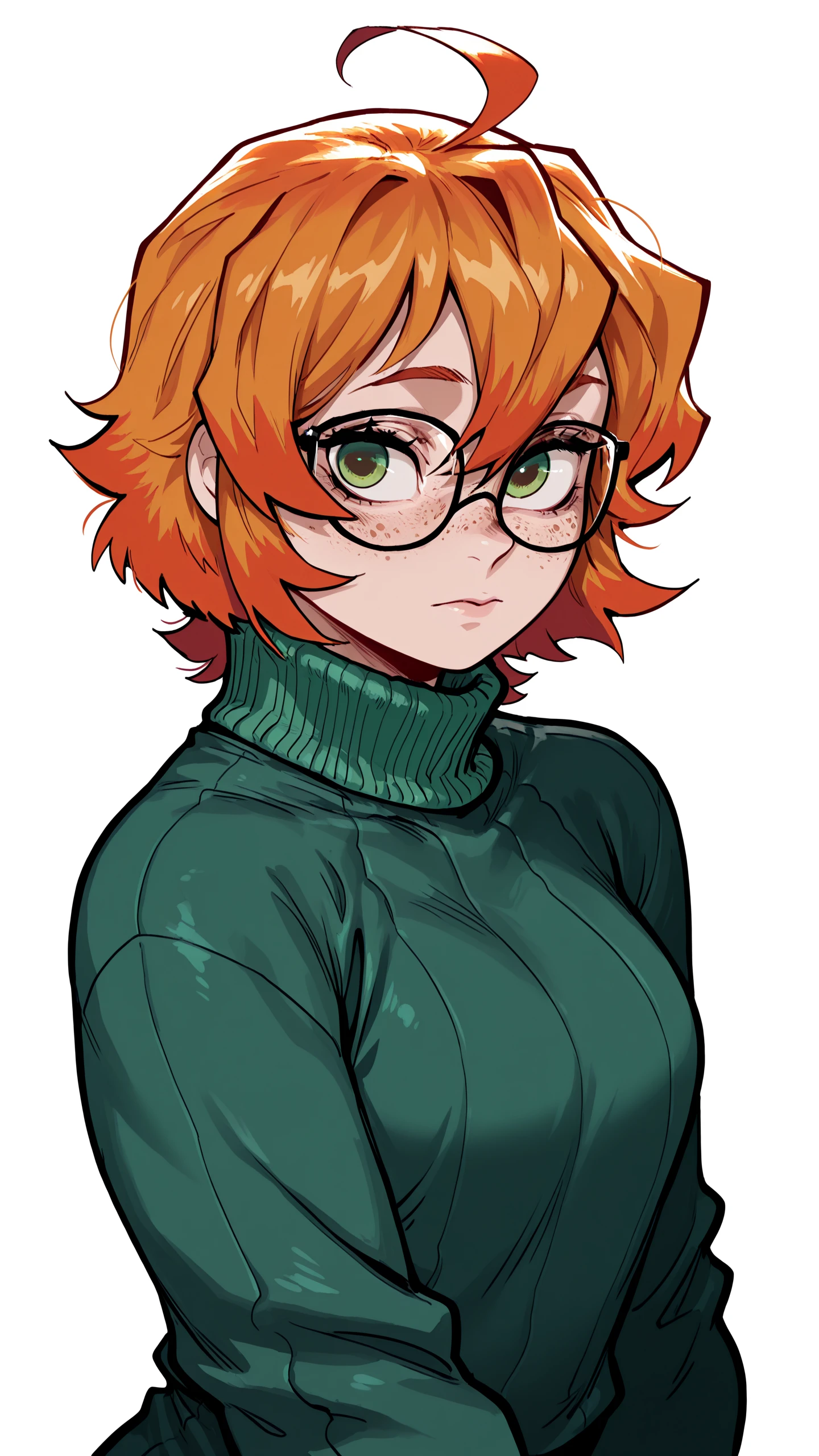 1girl, t1llian, green eyes, glasses, ahoge, freckles, orange hair, green sweater, short hair