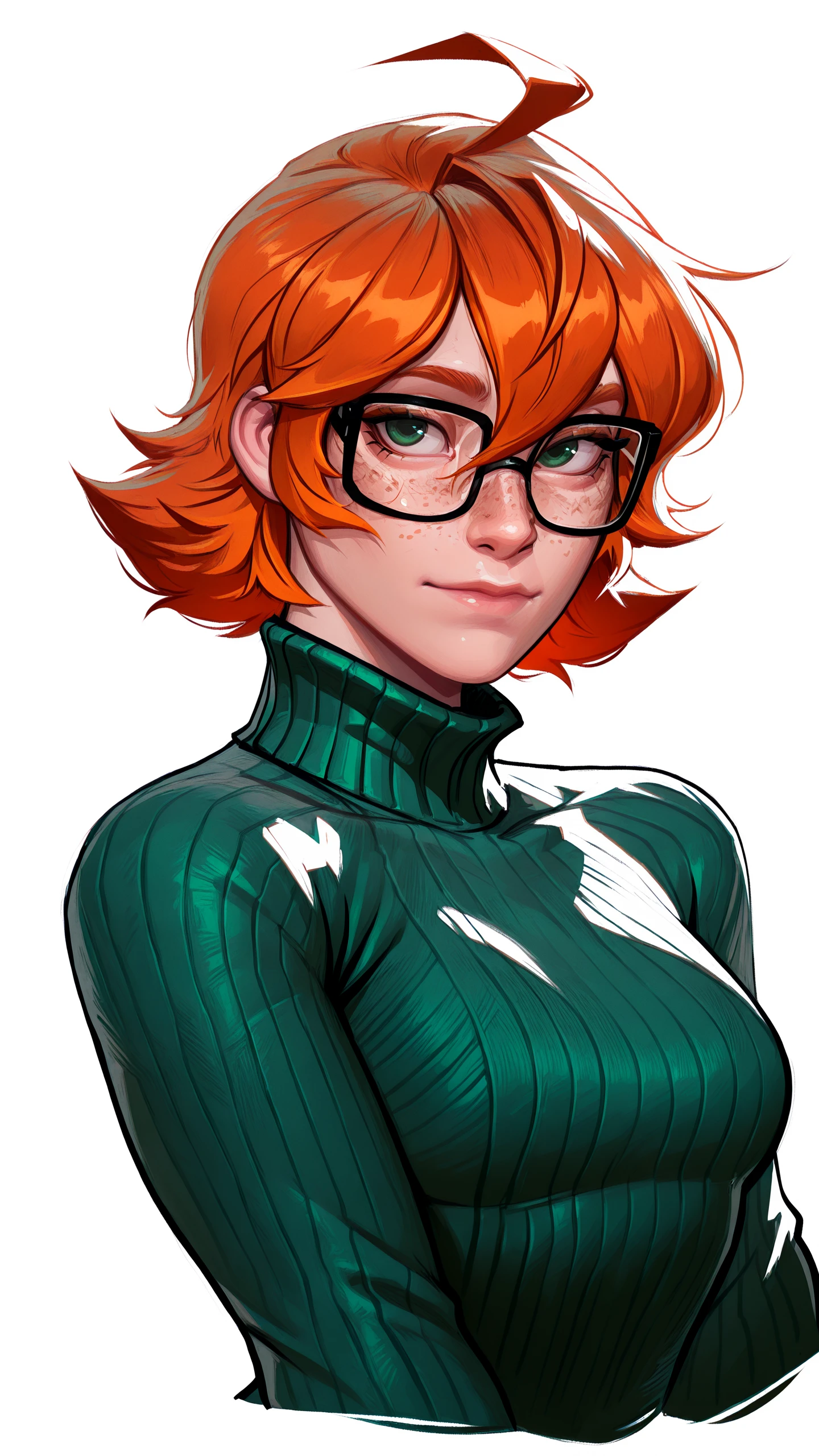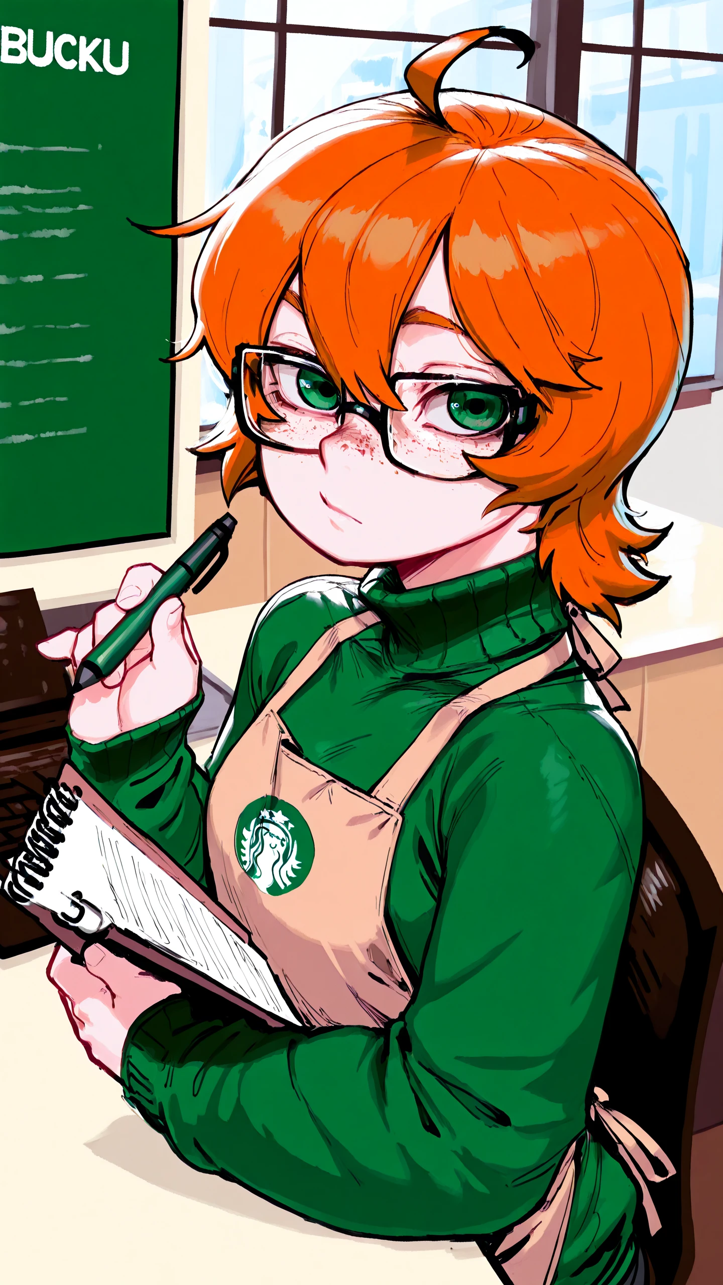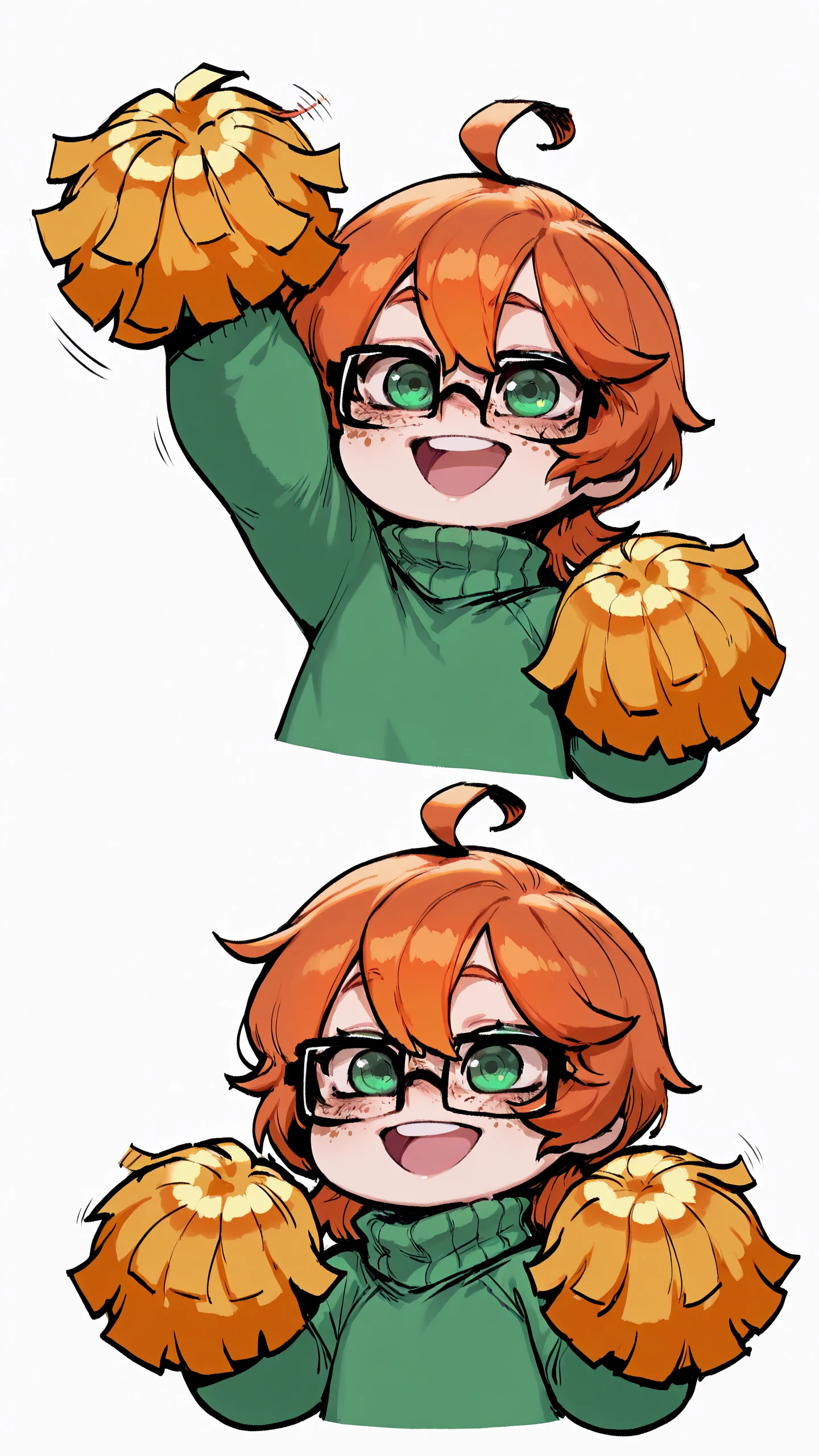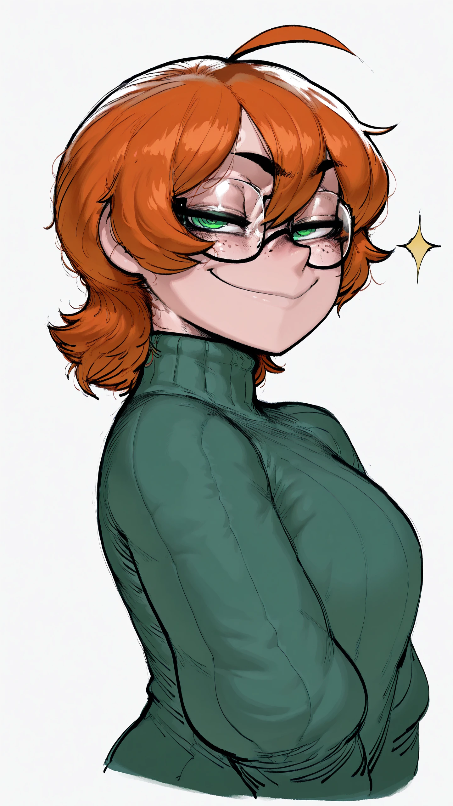 1girl, t1llian, green eyes, glasses, ahoge, freckles, orange hair, green sweater, short hair