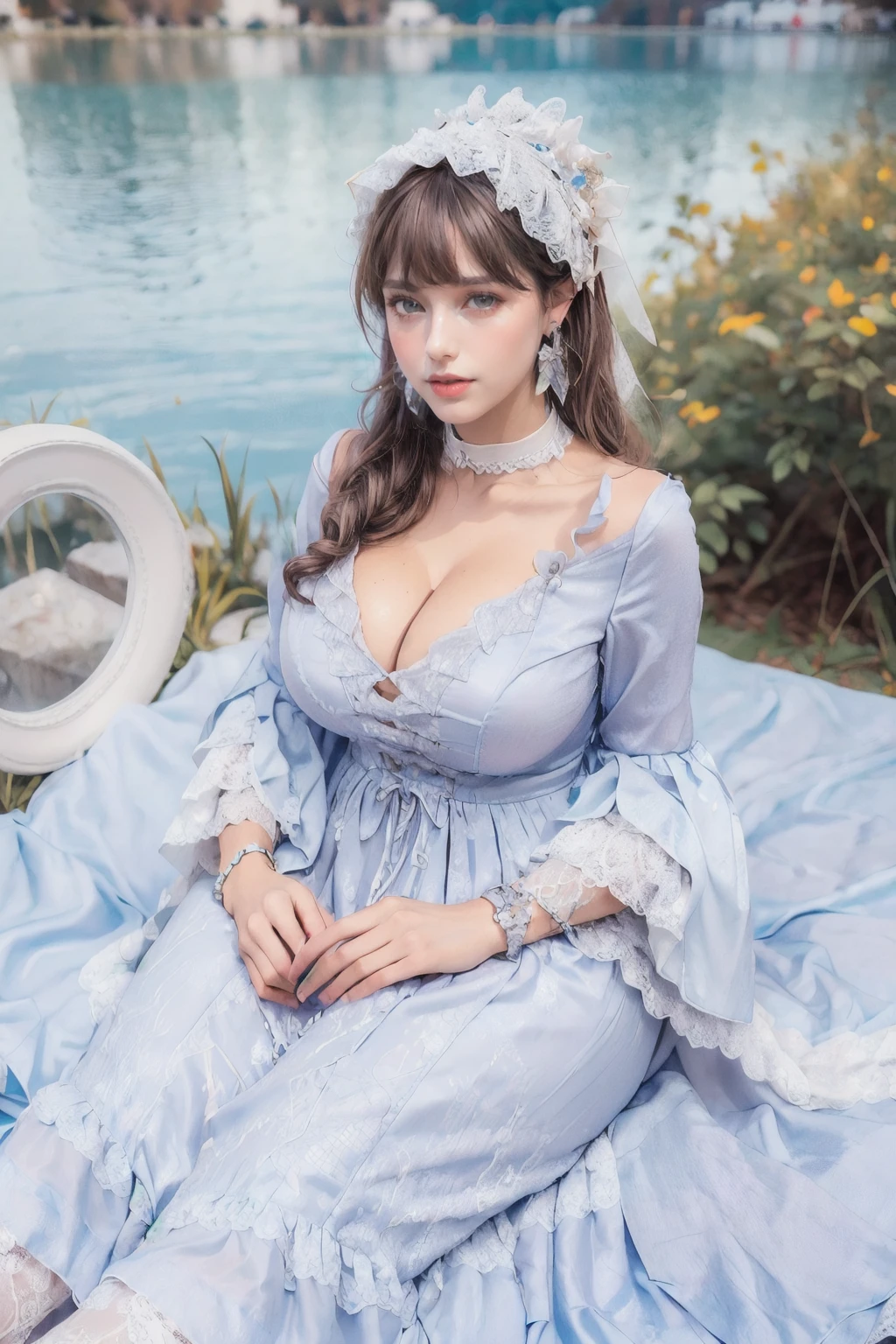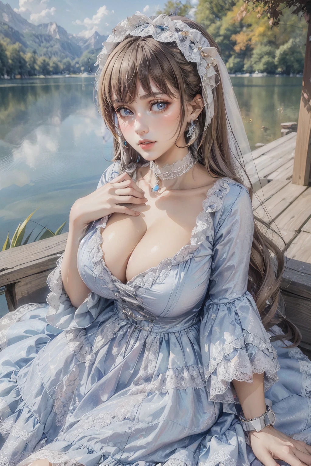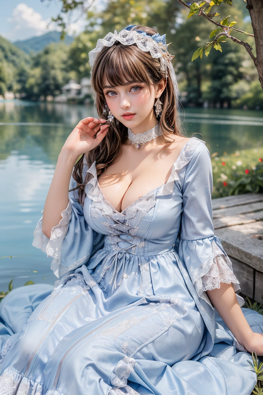 Diana,blue dress,jewelry,earrings,lace,lace trim,hair ornament,choker,long sleeves,