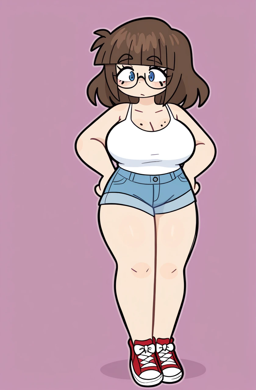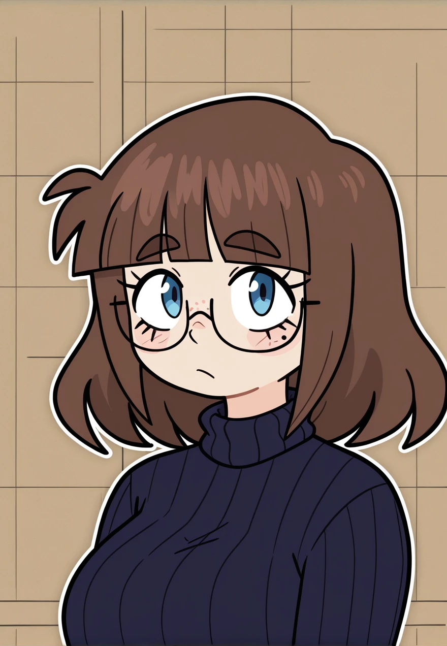 annacrayons, blue eyes, brown hair, medium hair, blunt bangs, thick eyebrows, semi-rimless eyewear, freckles, mole, mole under eye