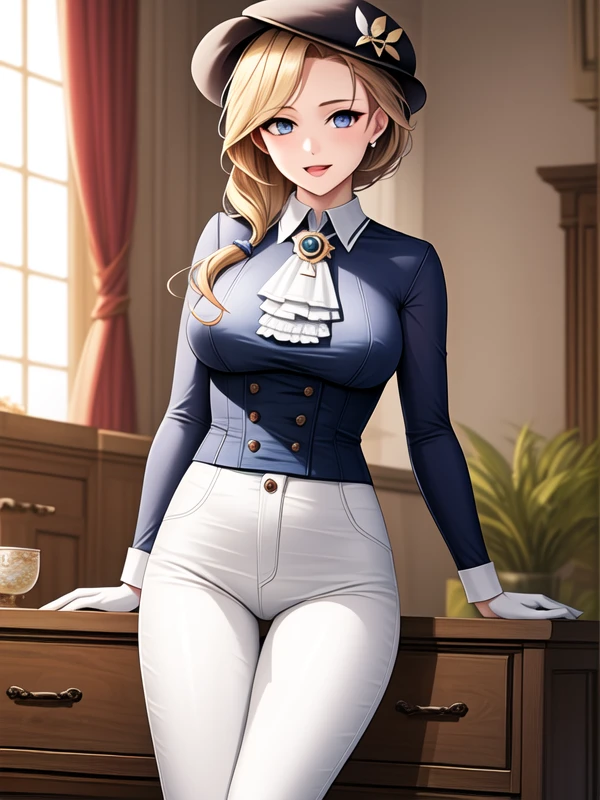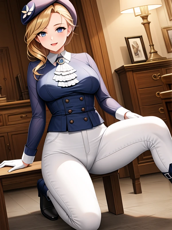 1girl, long hair, blue eyes, blonde hair, boots, pants, white gloves, Ascot, beret, blue jacket, hair over shoulder, white pants, white ascot, hood_(azur_lane), hood_(gentlewoman_and_stallion)_(azur_lane), riding_outfit