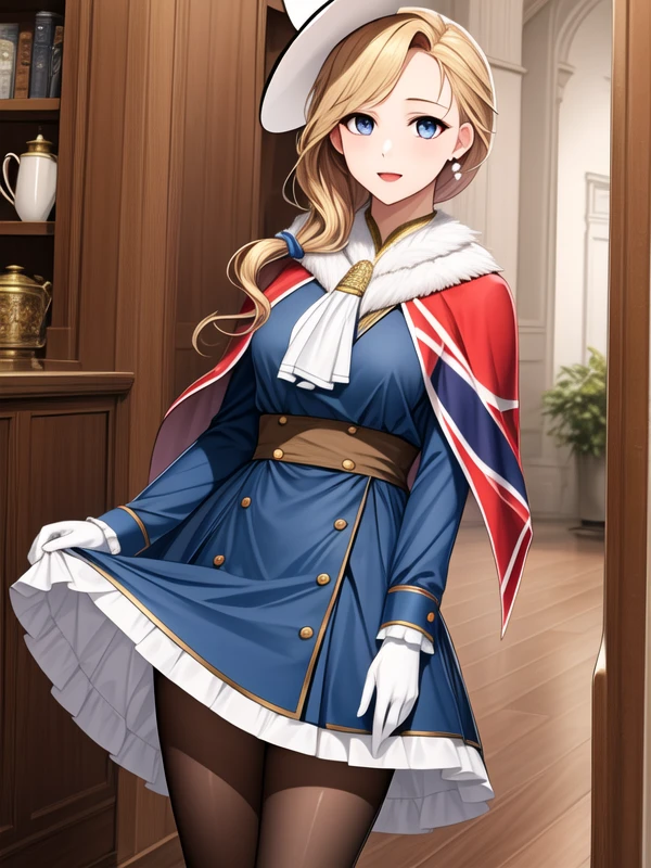 black pantyhose, blonde hair, blue capelet, blue dress, blue eyes, blue skirt, def, earrings, frilled skirt, hair over shoulder, hat, hood_(azur_lane), jabot, jewelry, long dress, long hair, long skirt, long sleeves, tilted headwear, union jack, white gloves, white headwear