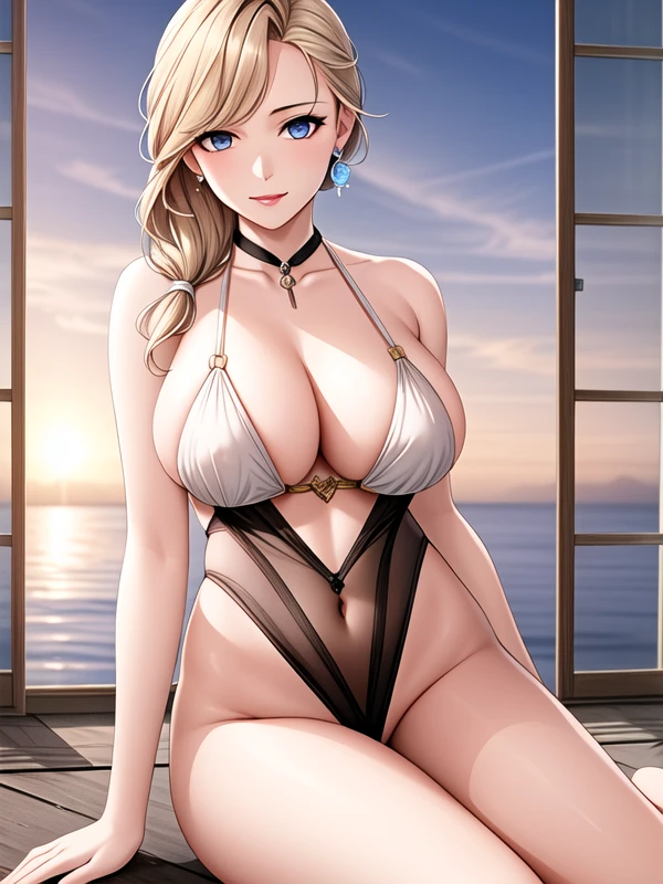 long hair, blue eyes, blonde hair, bare shoulders, jewelry, collarbone, swimsuit earrings, hair flower, arm up, see-through, one-piece swimsuit, covered navel, thigh strap, hair over shoulder, hood_(azur_lane), hood_(lady_of_the_shining_sun)_(azur_lane), choker, two-tone_swimsuit, multicolored swimsuit