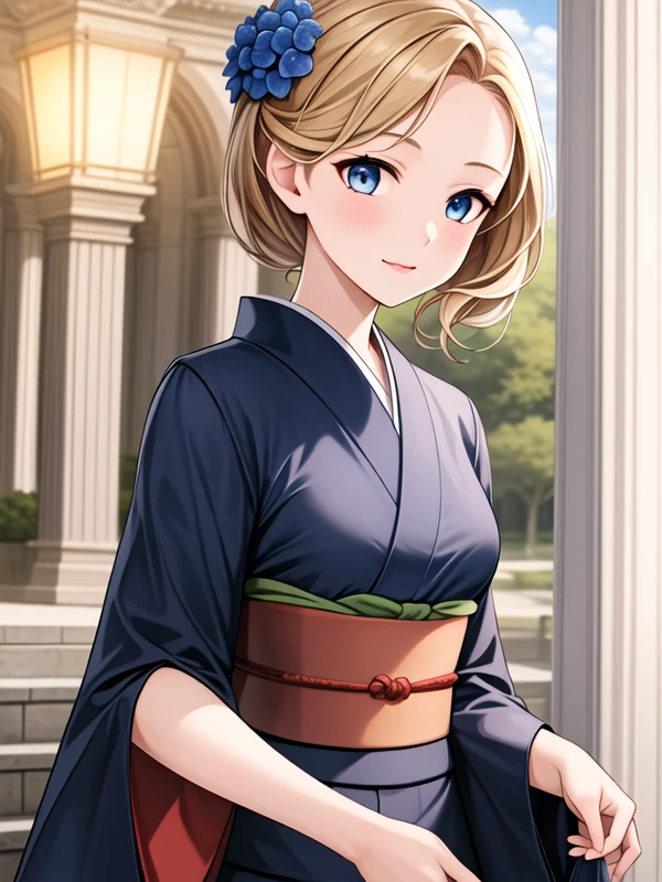 blue eyes, blonde hair, japanese clothes, hair flower, lantern, print kimono, floral print, hair over shoulder, blue flower, obi, blue kimono, wide sleeves, hood_(azur_lane), hood_(porcelain_grace)_(azur_lane)