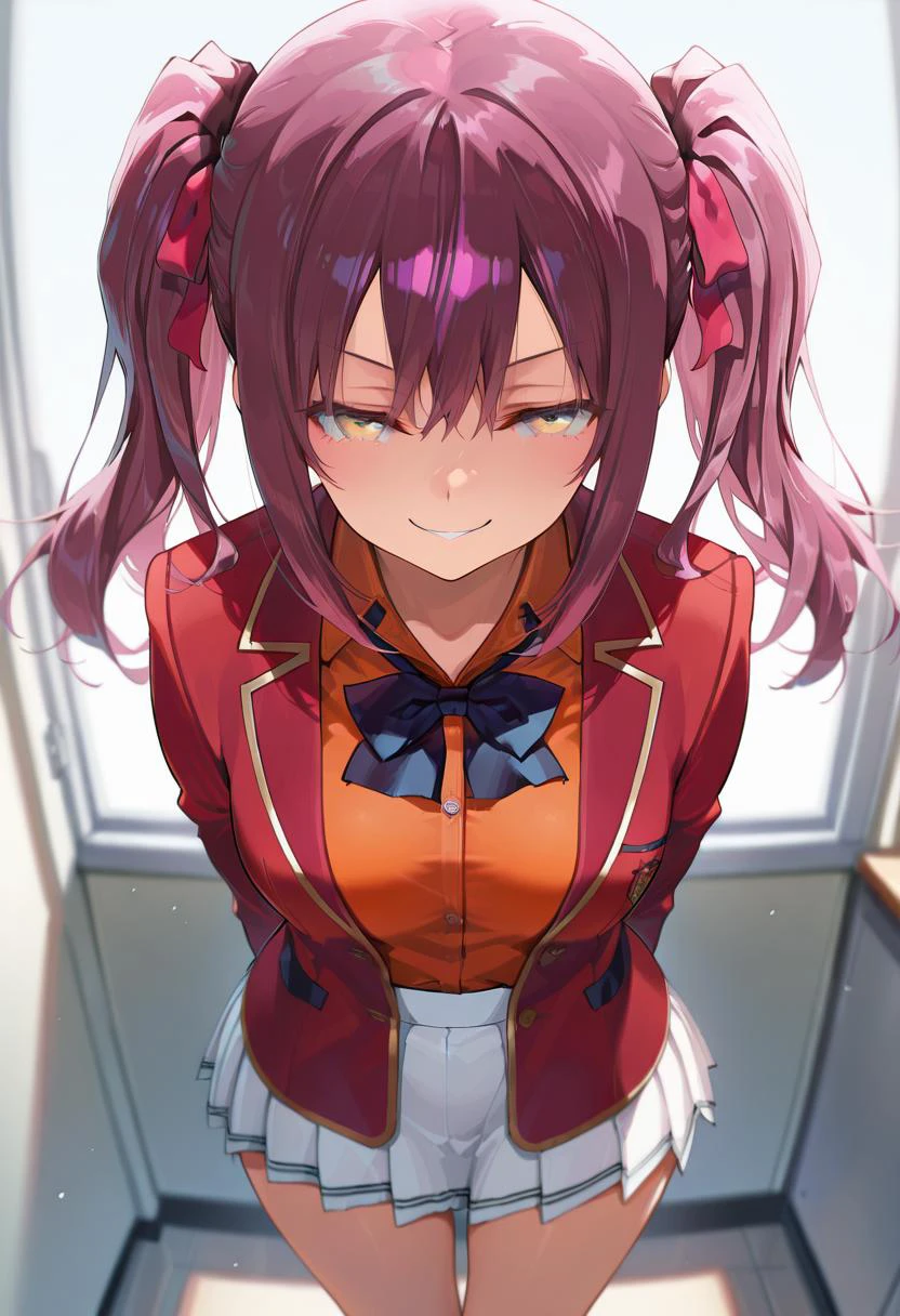 amasawa ichika,ribbon,twintails,long hair,hair ribbon,yellow eyes,purple hair,red hair,