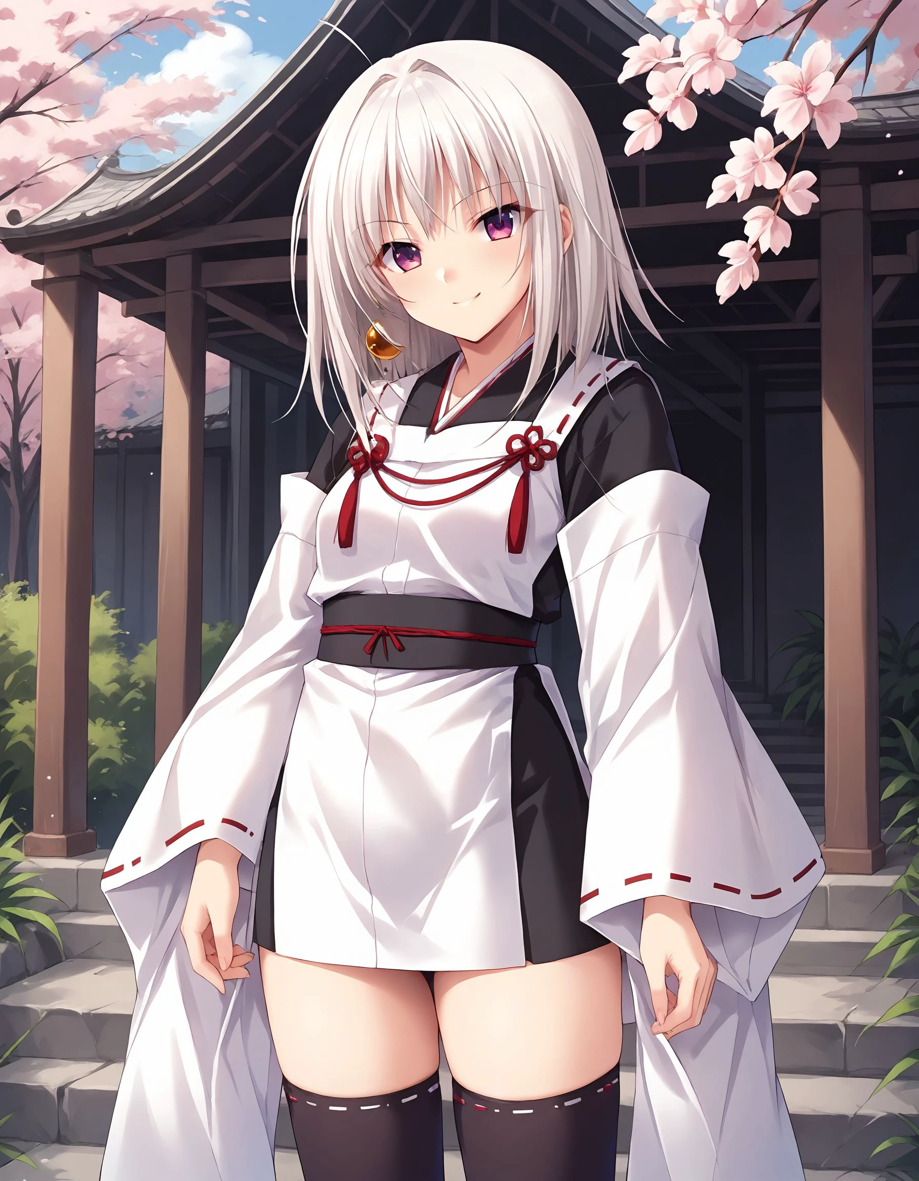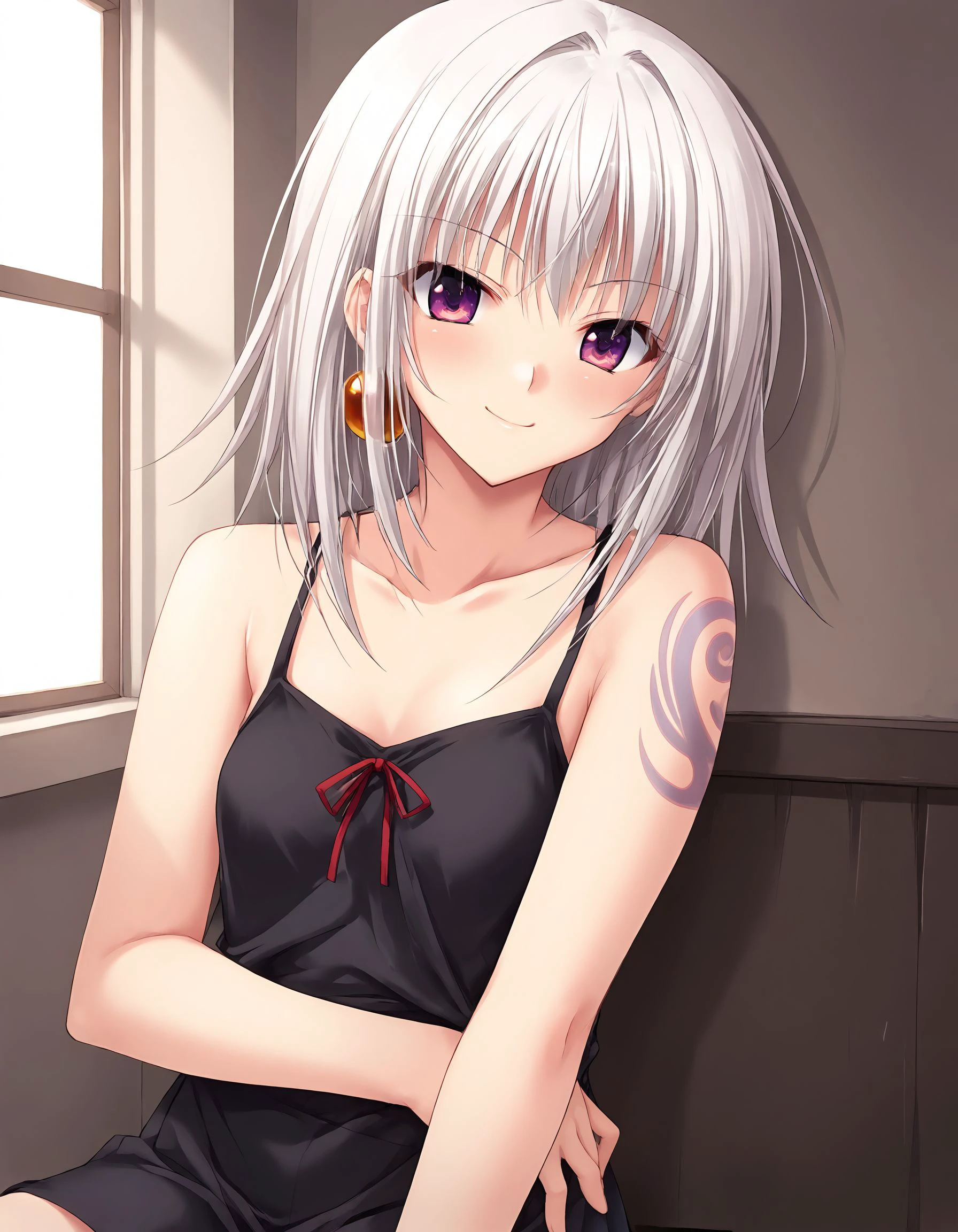tsuki-kagami, white hair, medium hair, hair down, 2antena hair, ear ornament, purple eyes, pink eyes, small breasts, tattoo on own left shoulder
