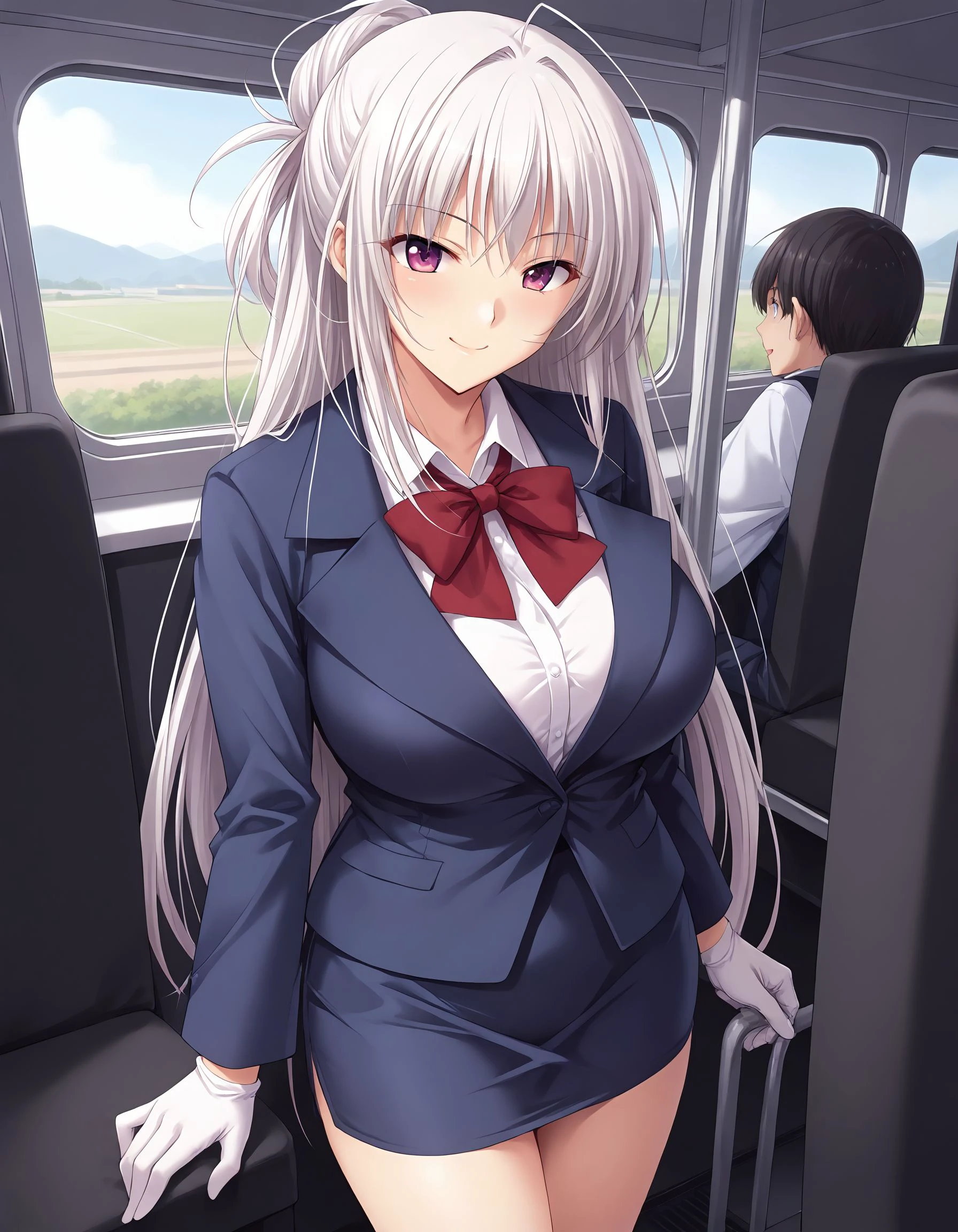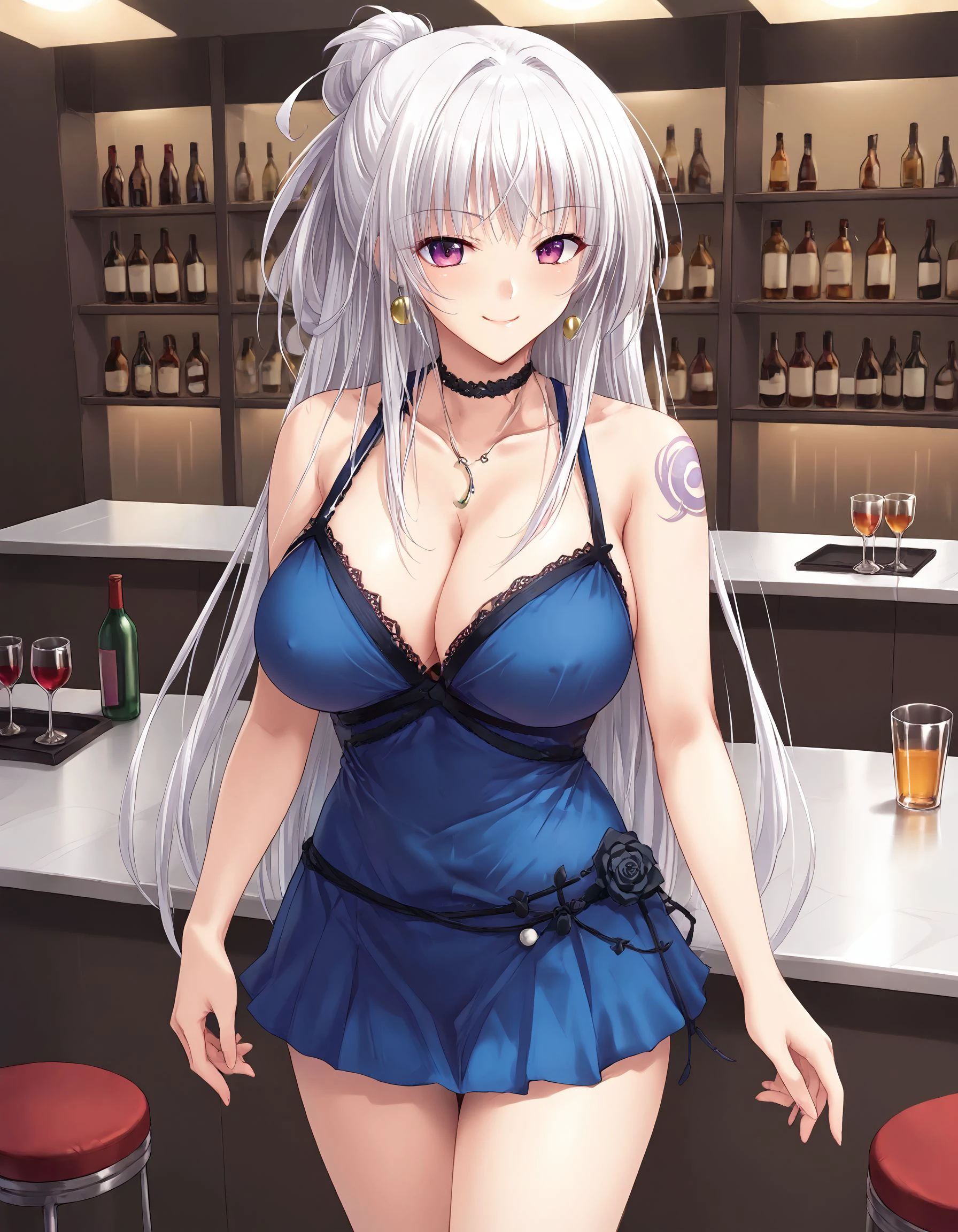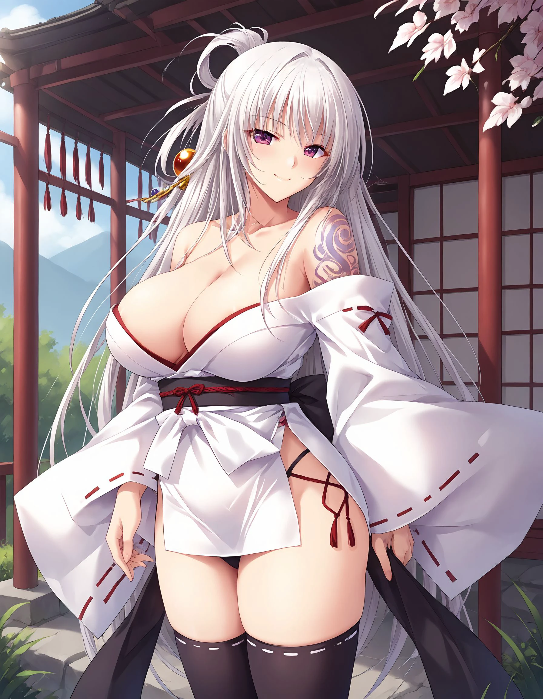 tsukimi-kagamino, white hair, long hair, 2antena hair, hair up, hair ornament, purple eyes, pink eyes, huge breasts, tattoo on own left shoulder,