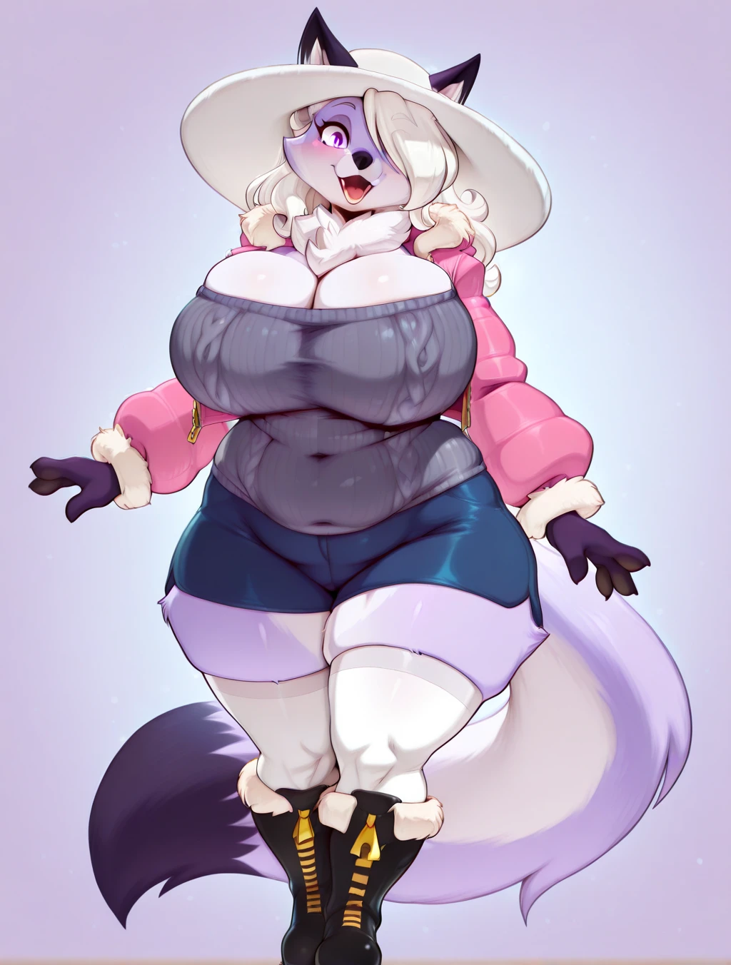 (white hat, cartwheel hat, gray sweater, oversized sweater, lined sweater, cleavage, fur trim, fur-trimmed pink jacket, cropped jacket, open jacket, faux fur cuff sleeves, long shorts, dark-blue shorts, legwear, stockings, white stockings, boots, knee-high boots, black boots, faux fur boots)