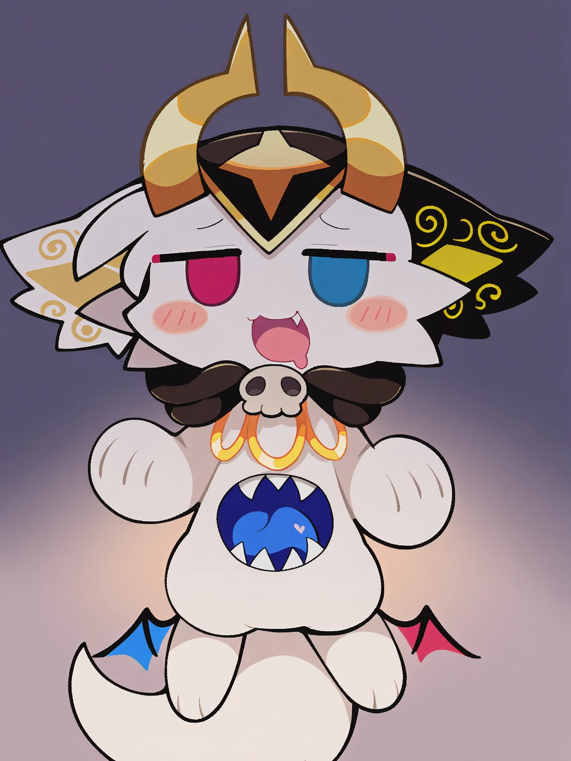 /devilun, demon, grey fur, black horns, black cape, skull clasp, ???? wings, heterochromia, stomach eye, mini crown, chibi form