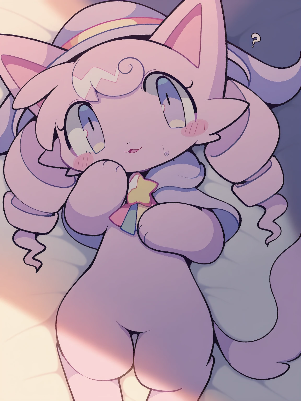 /meteor, cat, light pink fur, purple eyes, light purple capelet, star brooch, rainbow ribbon, light purple witch hat, (star wand, holding)