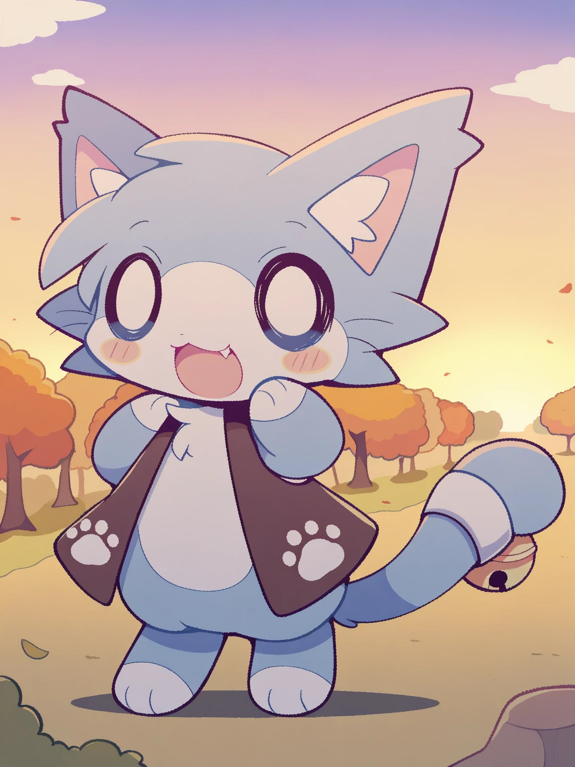 /hoshikake, cat, blue and white fur, fang, tail bell, vest, simple eyes, empty eyes,