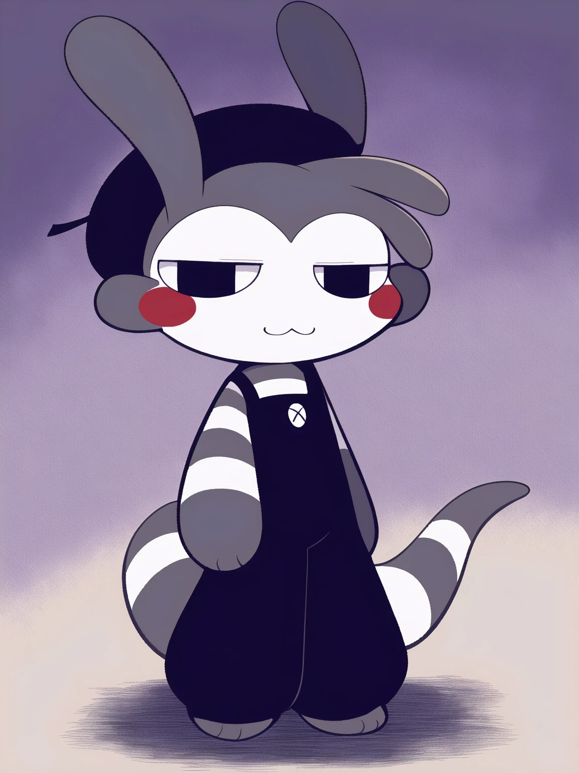 /pampty, lizard, grey and white striped body, white face, black eyes, black beret, black overalls, red cheeks, simple eyes