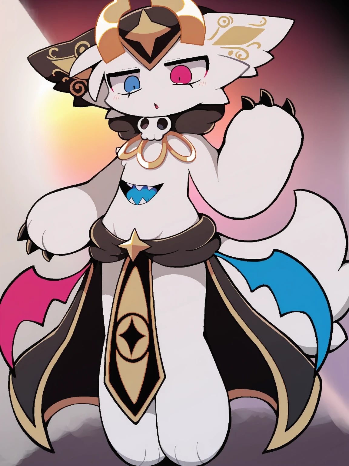 /bbb, demon, white fur, heterochromia, ear markings, ???? wings, stomach mouth, skull clasp, golden ring necklace, waist cape, golden headpiece, waist tabard, true form