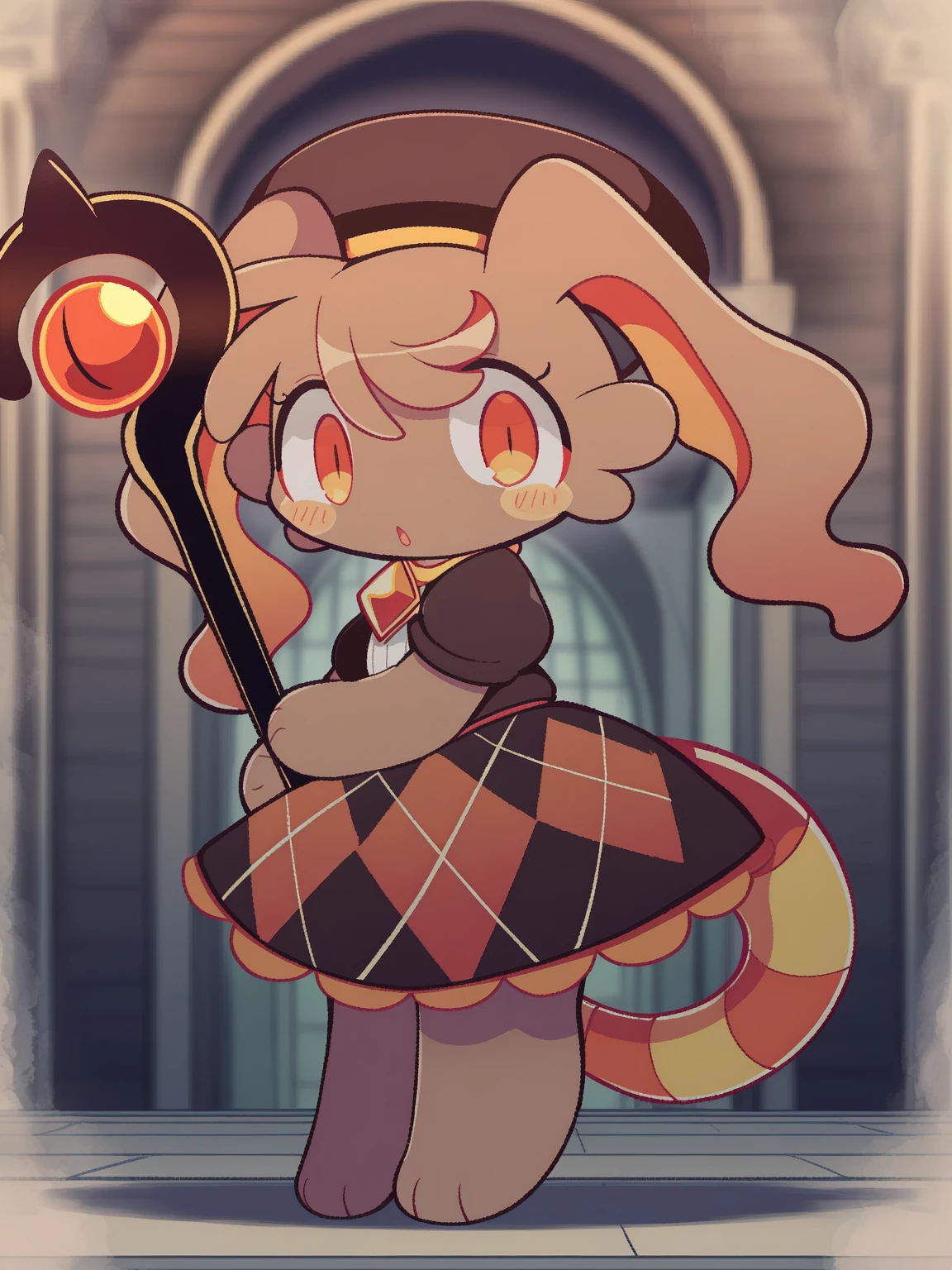 /lamia, snake, orange eyes, striped snake tail, brown fur, brown beret, dark brown blouse, bark brown and red skirt, orange gem brooch, (snake eye staff, holding)