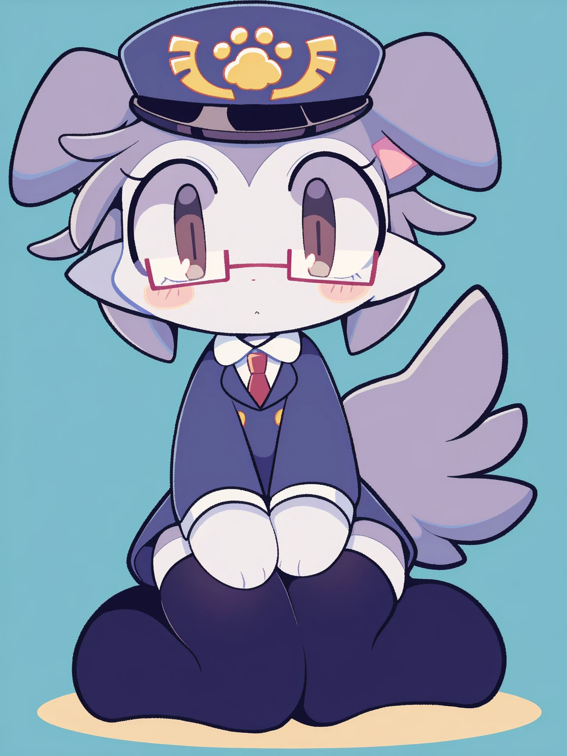 /connie, dog, grey and white fur, square red glasses, brown eyes, short floppy ears, police hat, thighhighs, blue shirt