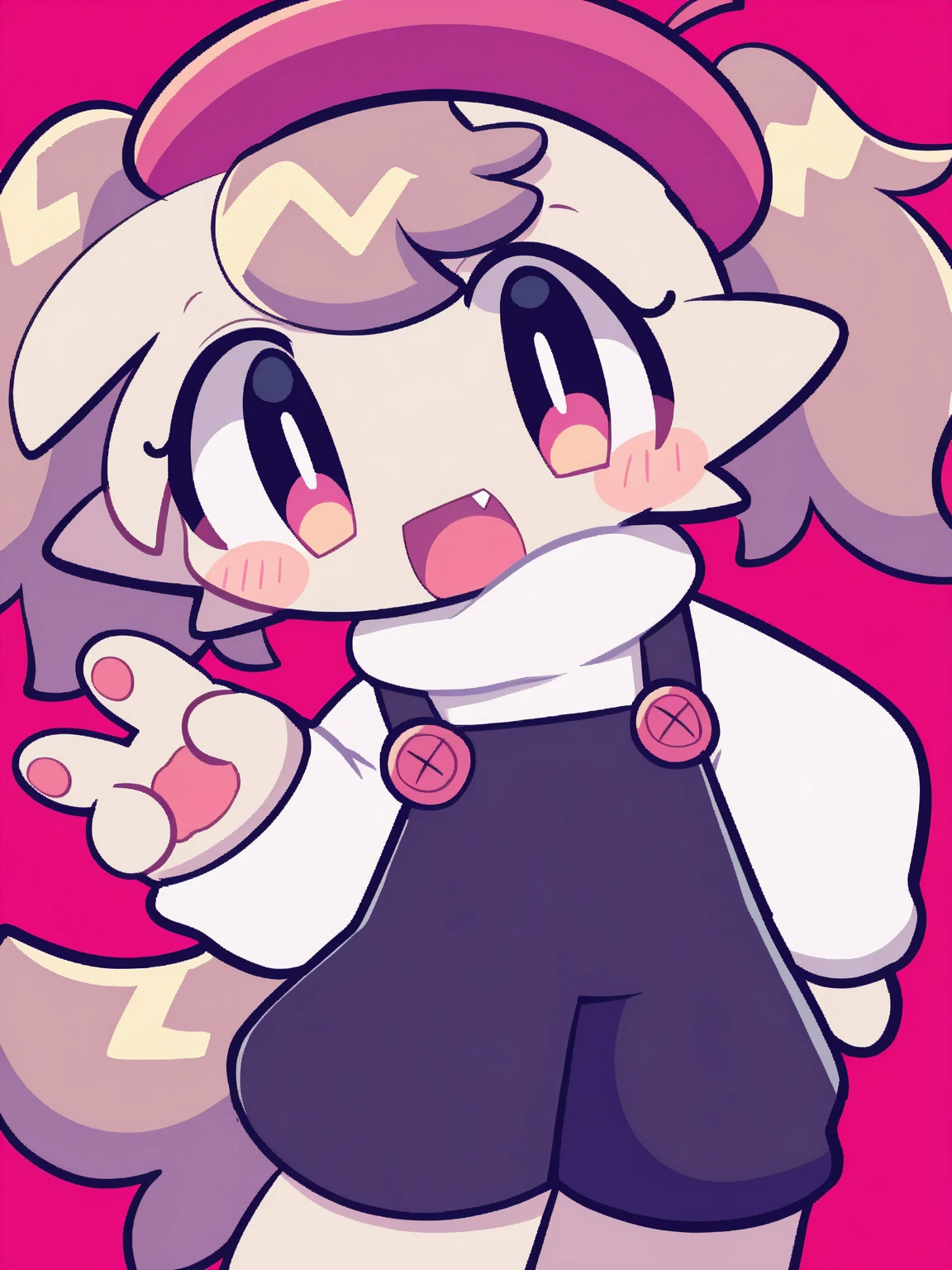 /babichao, dog, tan fur, brown pigtails, brown forehead hair, black overalls, pink beret, pinkish-brown eyes