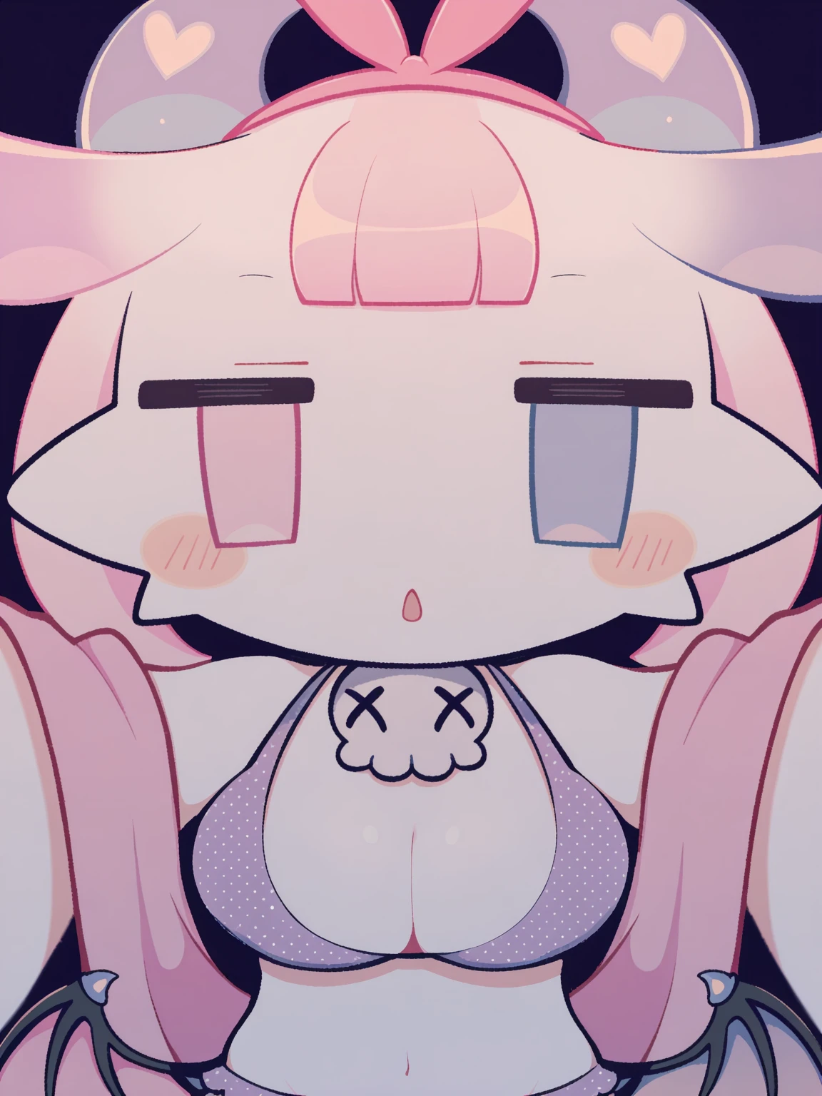 /amoamo, demon, pastel pink horns, white fur, heterochromia, ???? wings, pink thick heart tail, tentacle hair, skull clasp, jitome, simple eyes, bob haircut, true form, (pink ribbon headband, purple polka dot ??????, pink robe/pink sleep mask, sleepwear)