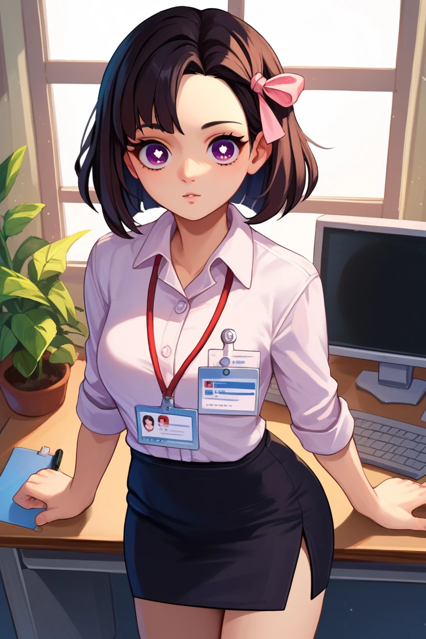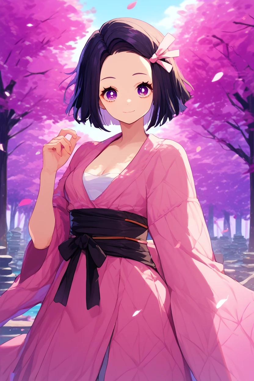 nezukorps, black hair, purple eyes, white pupils, pink hair ribbonShe can have: long hair, medium hair or short hair and her signature two-tone hairif you want the color change to be gradual, then go withgradient hair. As always, I'll leave examples in the gallery, I didn't inpaint or adetailer anything, so there's always room for improvement, everything is made with weight 1.