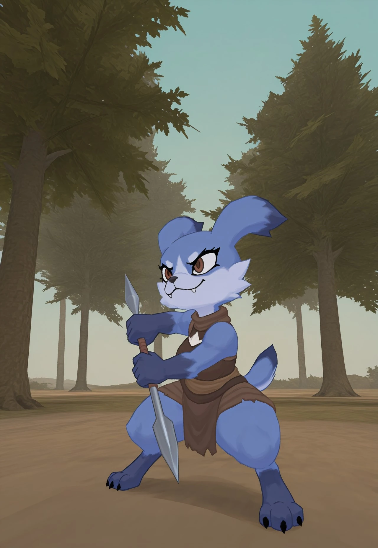 1girl, :3, fangs, red eyes, blue fur, black hands, black feet, tail, shorts, clothing