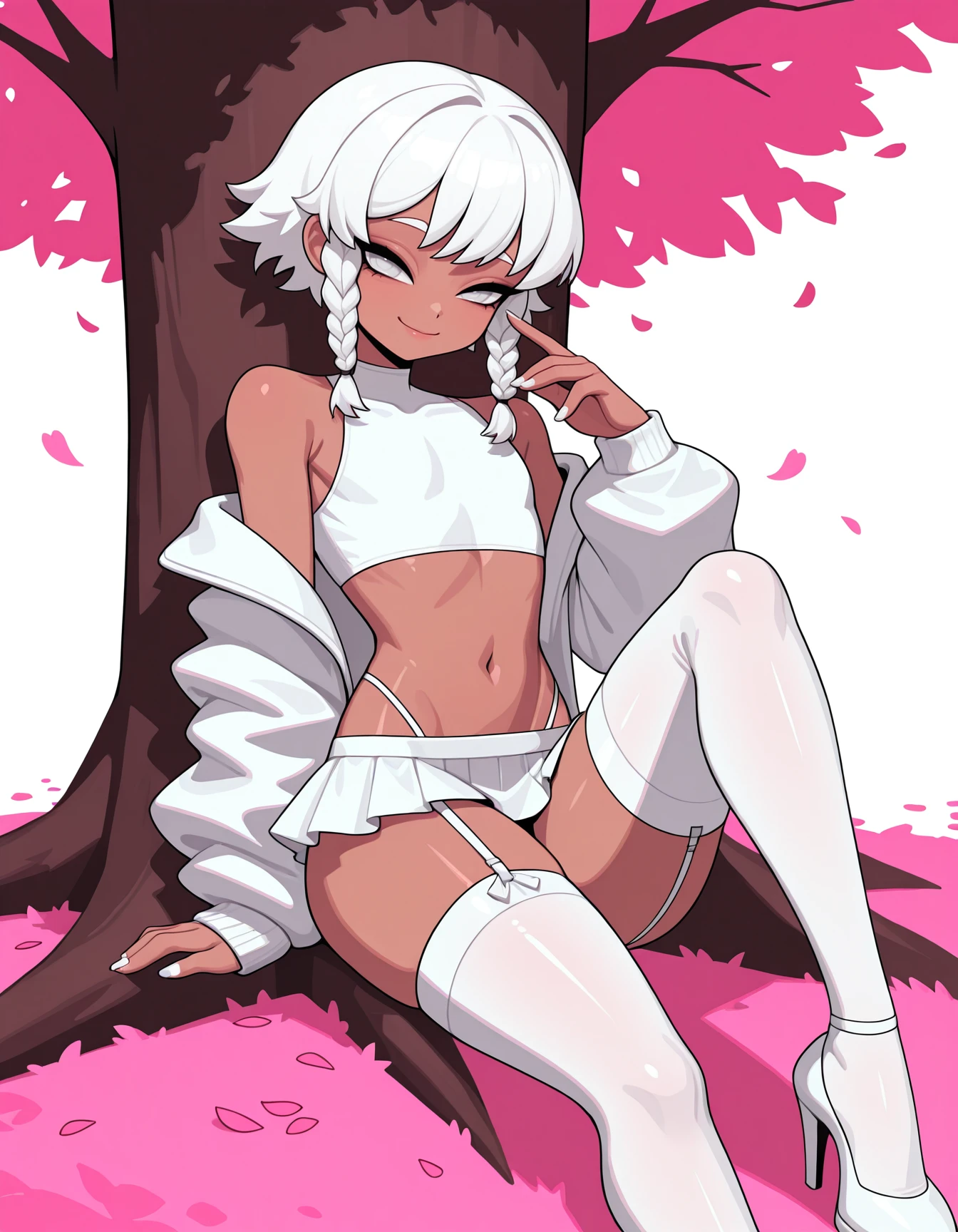 yuk1rei, dark-skinned male, otoko no ko, petite, white eyes, white hair, short hair, braided sidelocks, white nails, white eyebrows