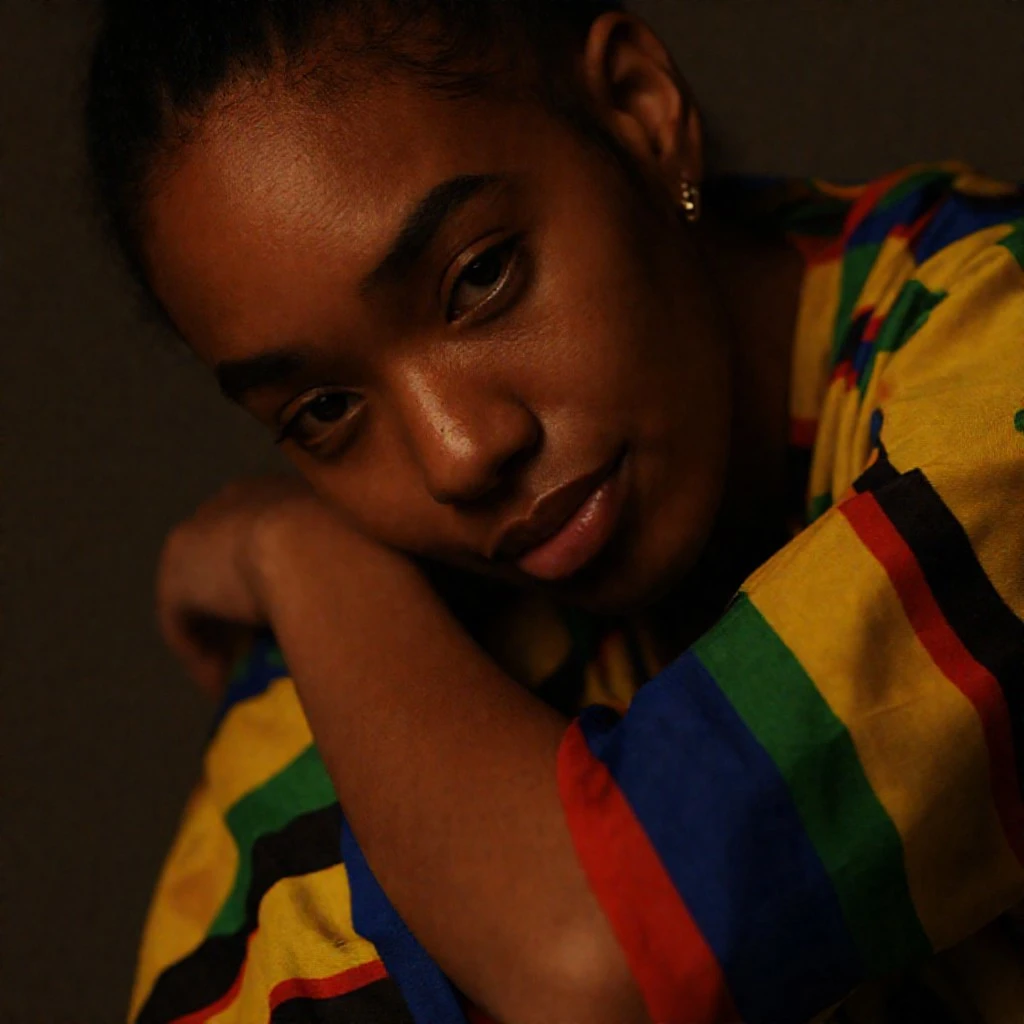 In fe85f14 style, a young woman with dark skin and expressive eyes looks directly at the viewer. Her head rests on her arm, bent gently near her shoulder. She wears a vibrant geometric-patterned scarf with warm and cool tones. Soft ambient light highlights the curve of her cheek and lips while the background melts into a smooth, warm blur. Her expression is contemplative, intimate, and quiet, with subtle highlight bloom around her features.