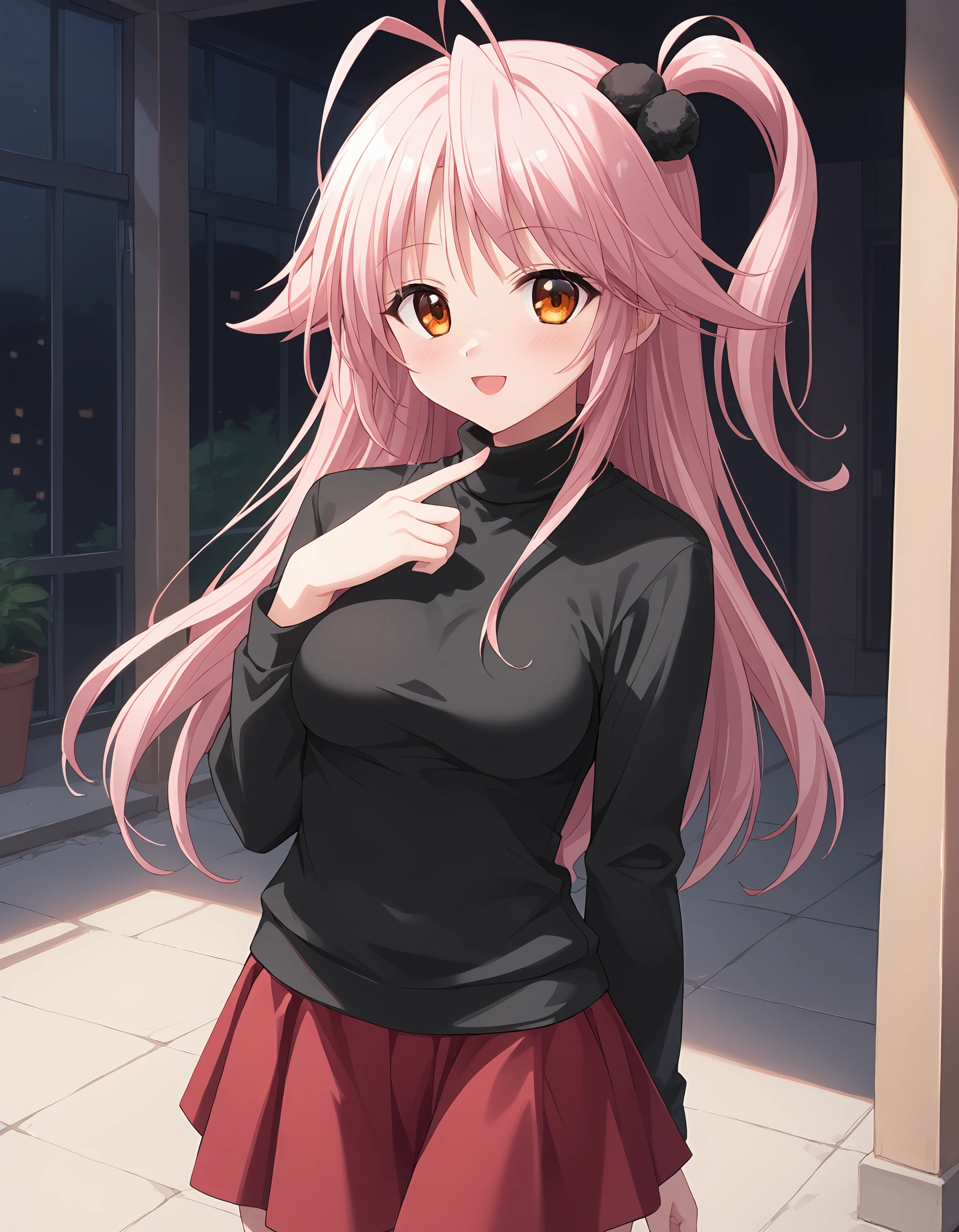 outfit03, T-shirt, black shirt, turtleneck shirt, long sleeves shirt, sleeves past wrist, skirt, mini skirt, red skirt,