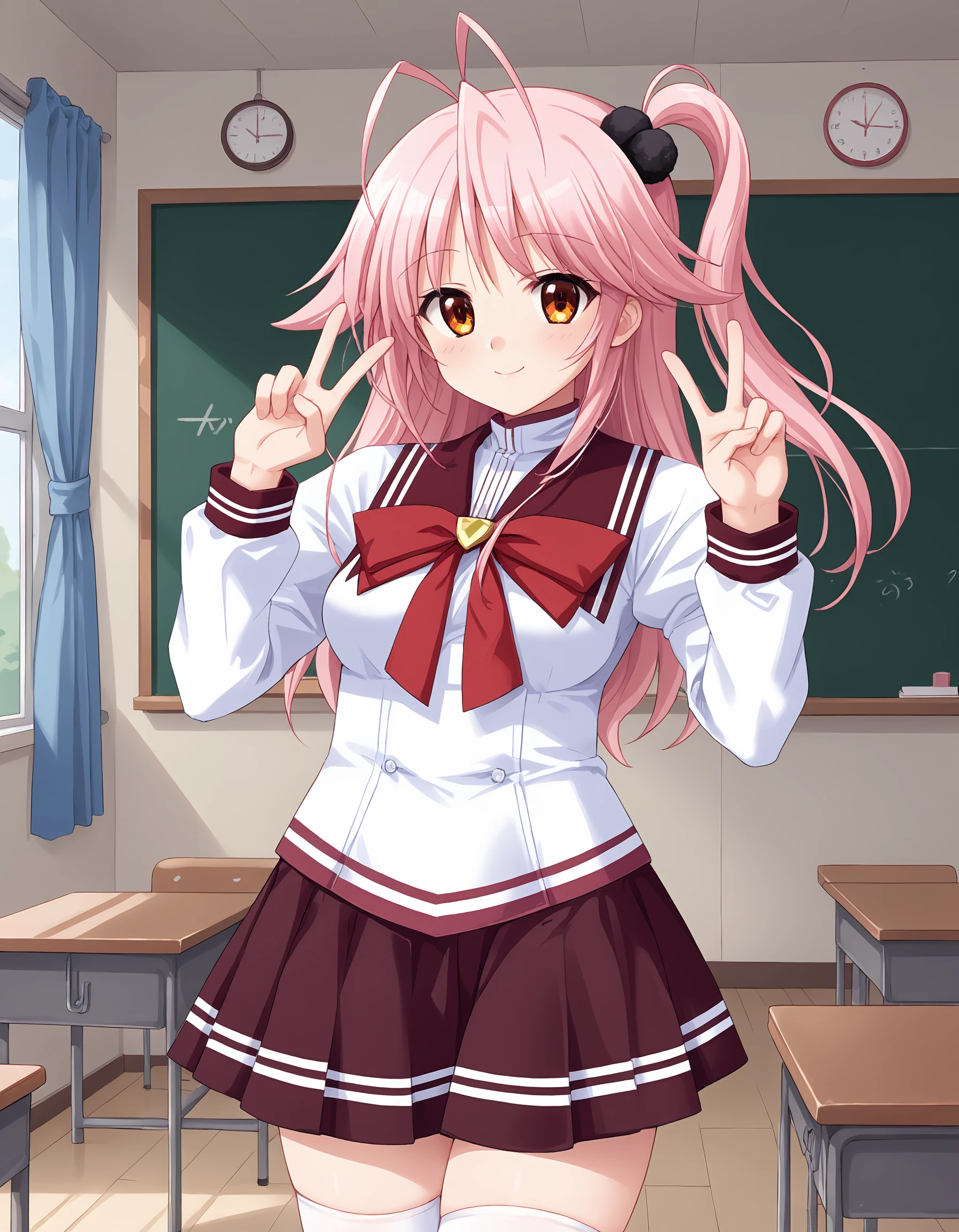 outfit01, sailor suit, sailor collar, crimson red sailor collar, shirt, white shirt, slit shirt, high neck shirt, crimson red lines taped shirt, shoulder pads, long sleeves, cuffs, crimson red cuff, bowtie, red bowtie, large bowtie, golden accessary on bowtie, skirt, pleated skirt, maroon skirt, mini skirt, white lines taped skirt, thighhighs, black thighhighs,