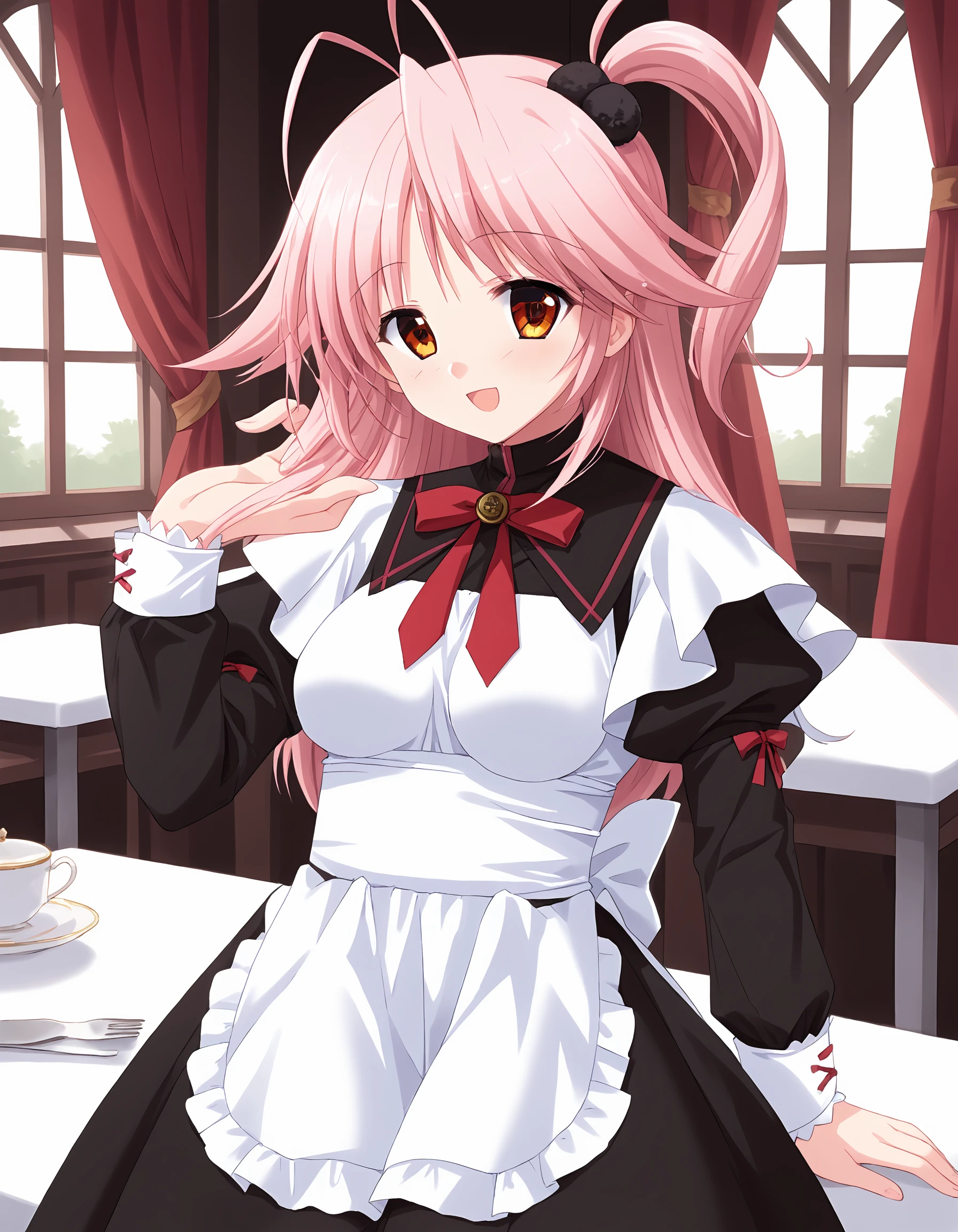outfit02, maid dress, dark brown dress, long sleeves, puffy sleeves, white cuffs, bow on sleeves, detached collar, ribbon tie, red ribbon tie, apron white apron, frilled apron,