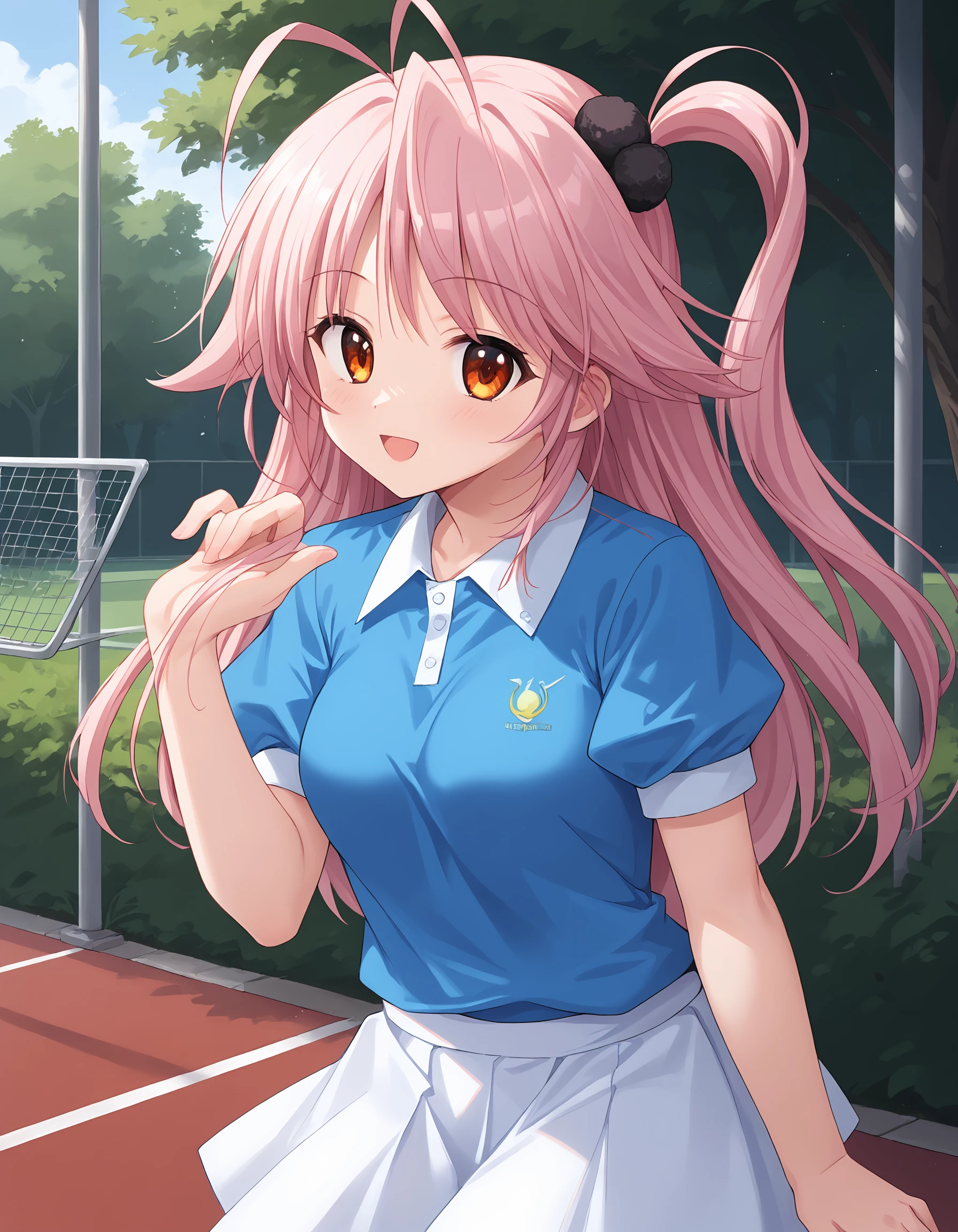 outfit04, tennis wear, polo shirt, light blue polo shirt, short sleeves, puffy sleeves, collarbone, skirt, white skirt, mini skirt, collarbone,