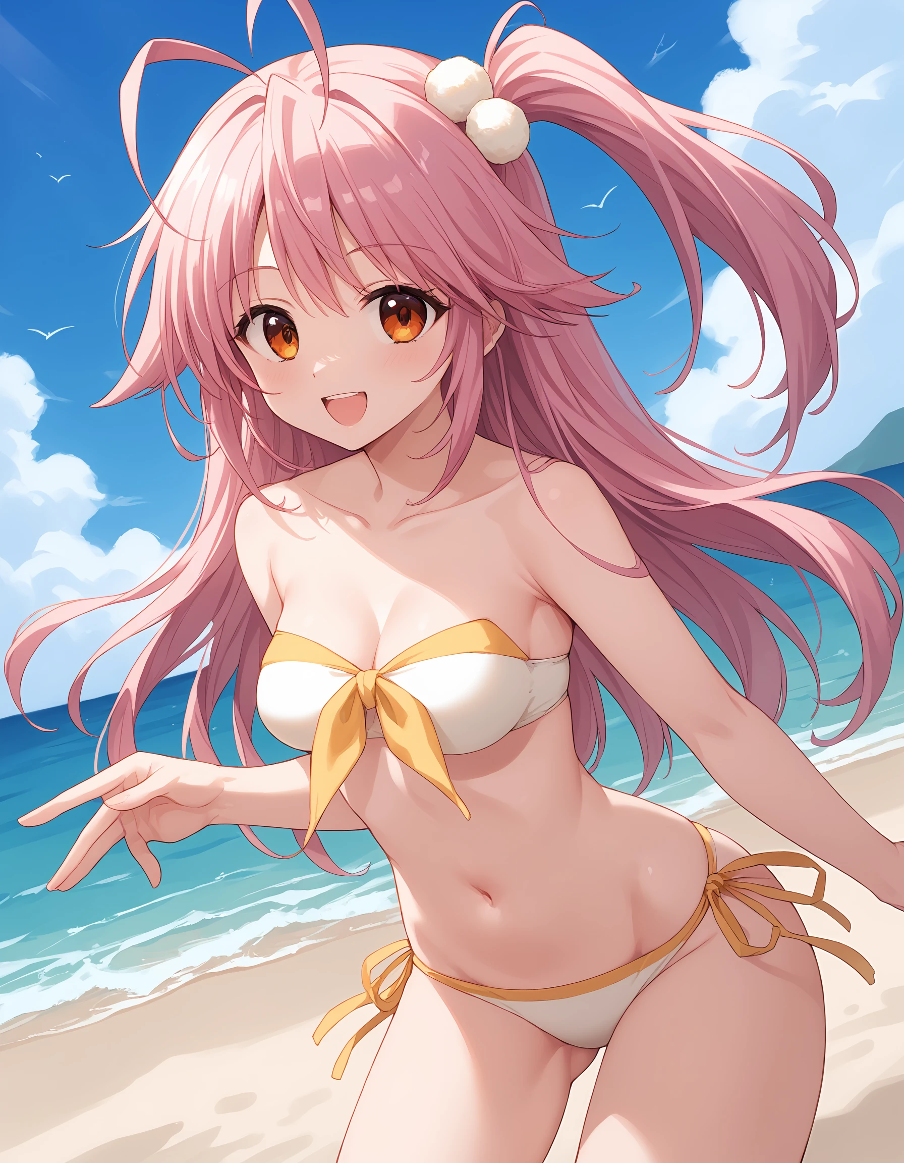 outfit05, bikini, white bikini, yellow taped bikini, bow bikini top, yellow bow, strapless, strapless bikini top, side tie bikini bottom, white bobbles