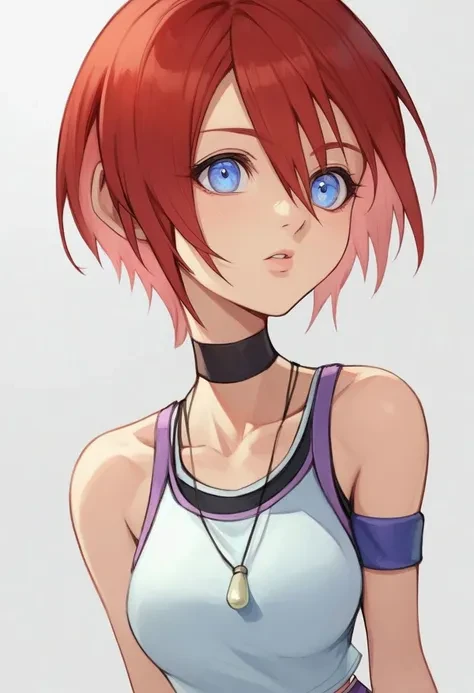 kairi_kh1, skirt, miniskirt, gym shorts, shorts underneath skirt, short hair, red hair, hair between eyes, blue eyes, jewelry, necklace, choker, black choker, wristband, shoes, , midriff, navel, shoulders, bracelet, white shirt, sleeveless, sleeveless shirt, tank top, crop top, collarbone, bangs