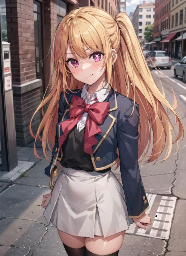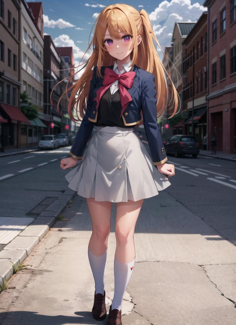 Recommended Prompts: hoshinoruby, 1girl, solo, medium breasts, skirt, blonde hair, black vest, socks, brown footwear, bow, school uniform, long hair, shoes, jacket, white socks, bowtie, loafers, blush, kneehighs, pink bow, grey skirt, blue jacket, open jacket, pink eyes, shirt, one side up, white skirt, white shirt, long sleeves, star-shaped pupil