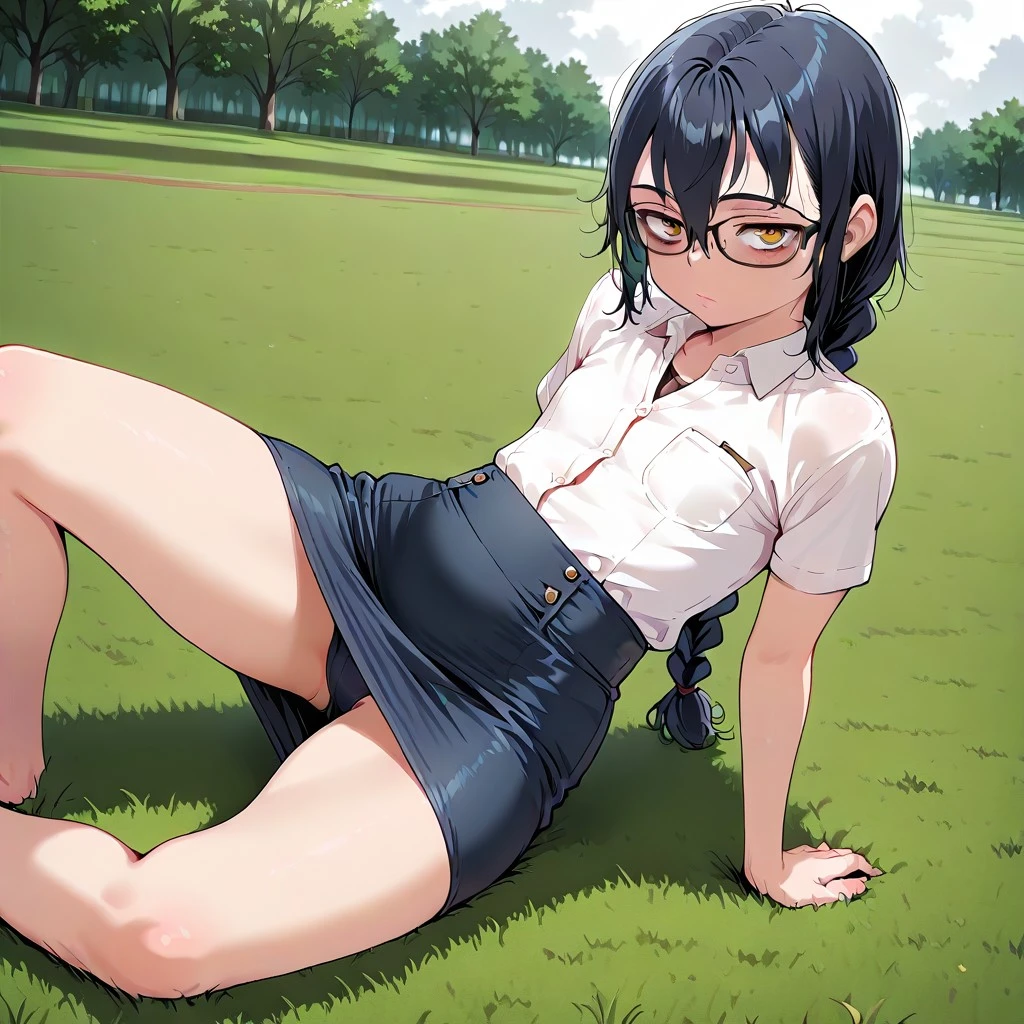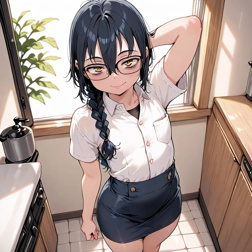 reikokirishima, dark blue hair, single braid ponytail, bags under eyes, amber eyes