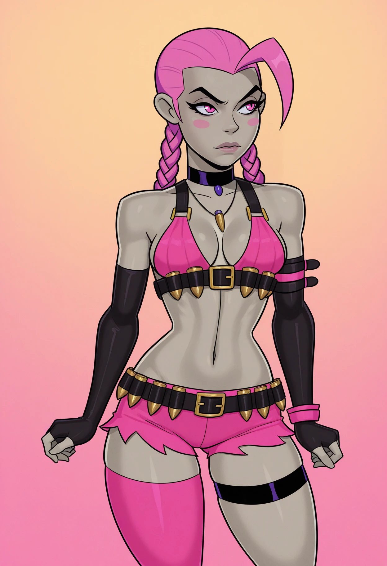 su_halloween_outfit, jinx (league of legends)jewelry, necklace, choker, swimsuit, bikini, pink bikini, navel, gloves, black gloves, elbow gloves, fingerless gloves, asymmetrical gloves, pink thighhighs, single elbow glove, belt, shorts, pink shorts, thighhighs, single thighhigh, thigh strap, pendant, bullet, bandolier, You can support my work by following the link: https://boosty.to/nmackelie